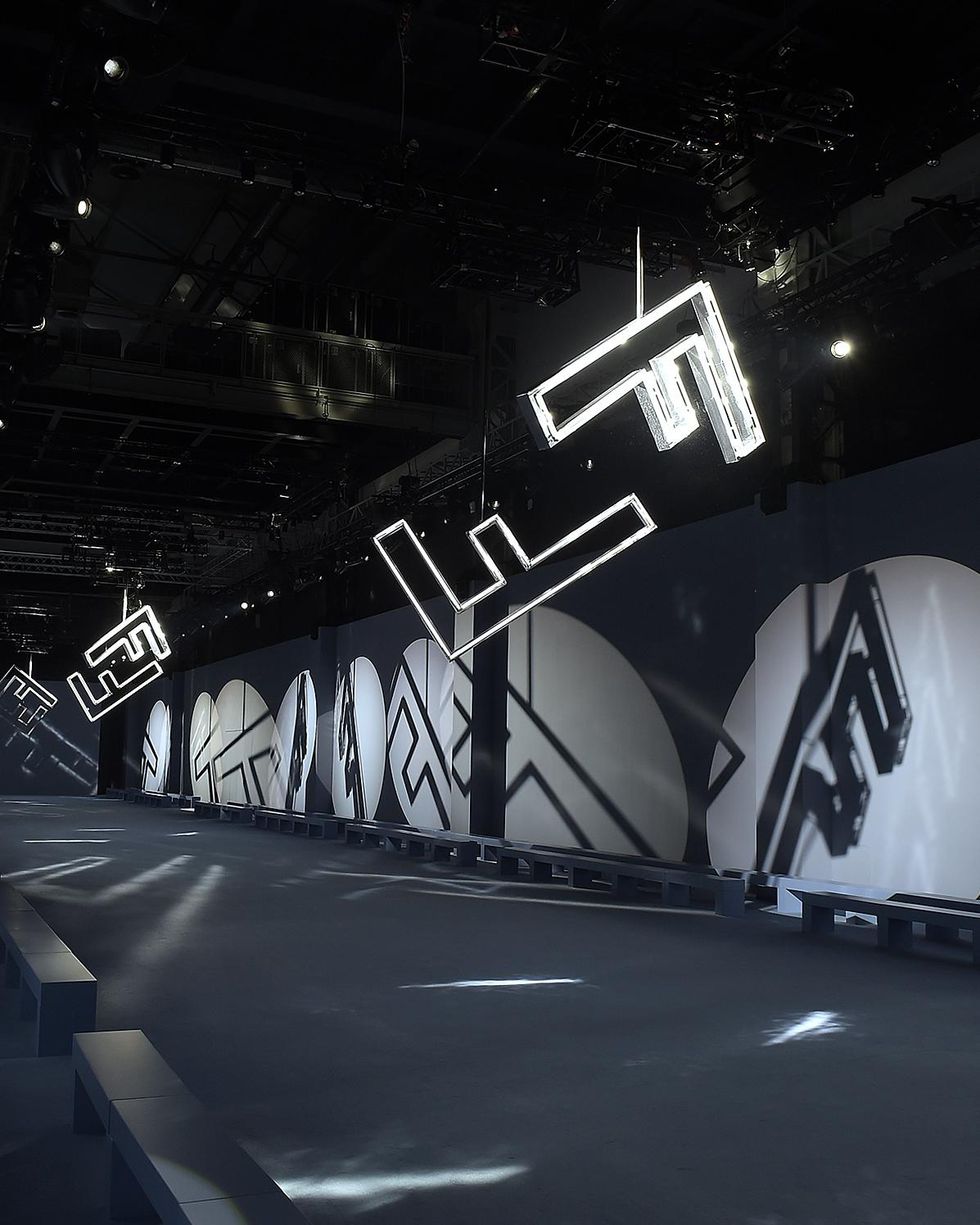 The brand's Via Solari showroom was once again the setting for the runway show, which featured sculptures of the brand's signature double-F logo hanging from the ceiling and projected in spotlights against the walls.