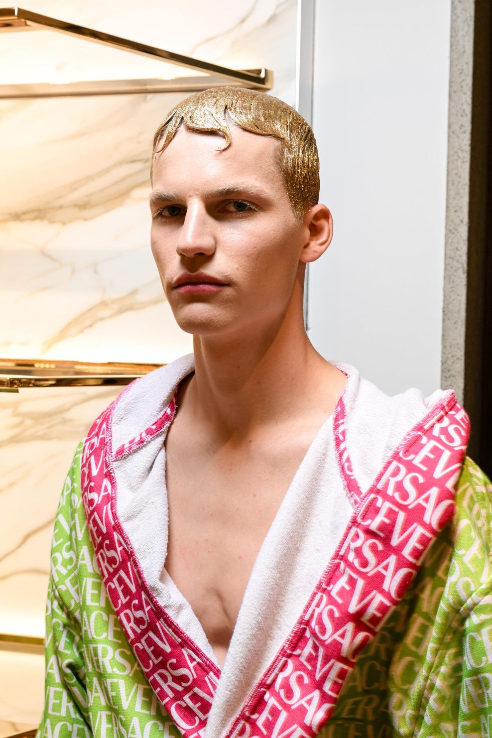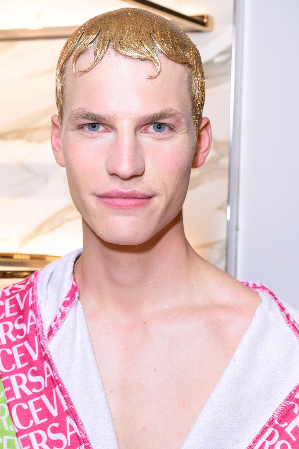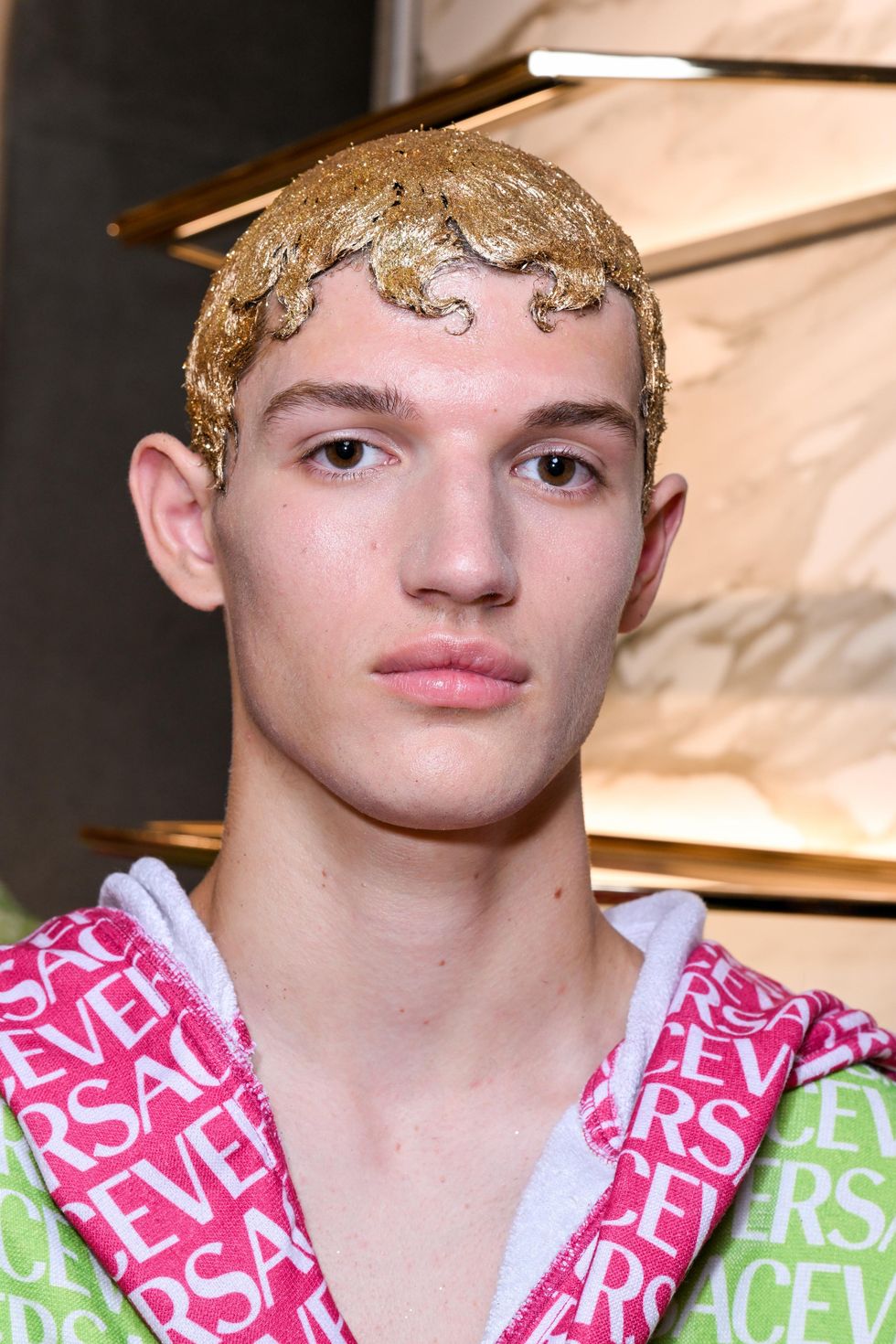 Gold is the color most synonymous with Versace's baroque universe, but it was still striking to see the models' hair covered in a layer of shimmery gold foil courtesy of iconic makeup and hair duo Pat McGrath and Guido Palau.