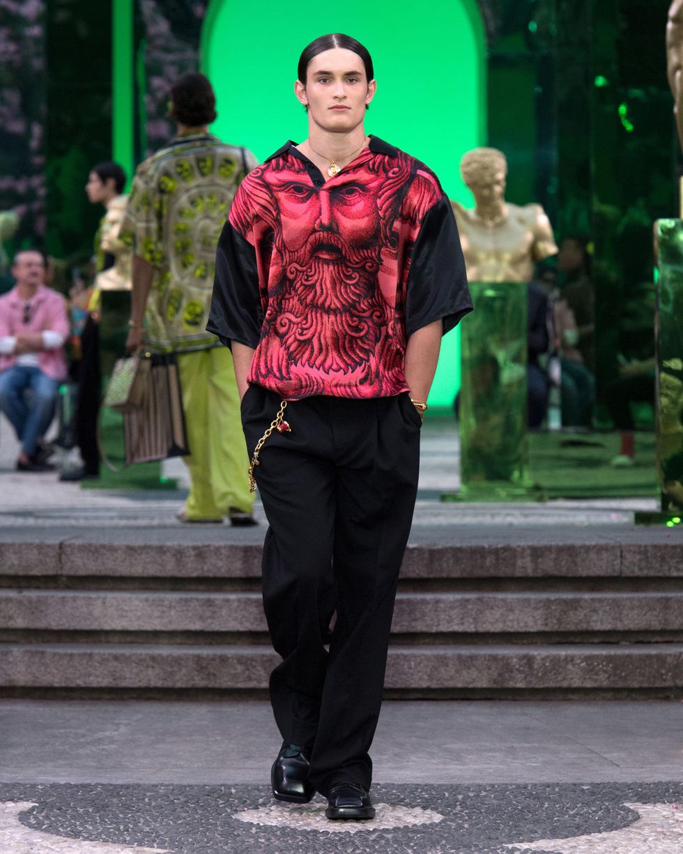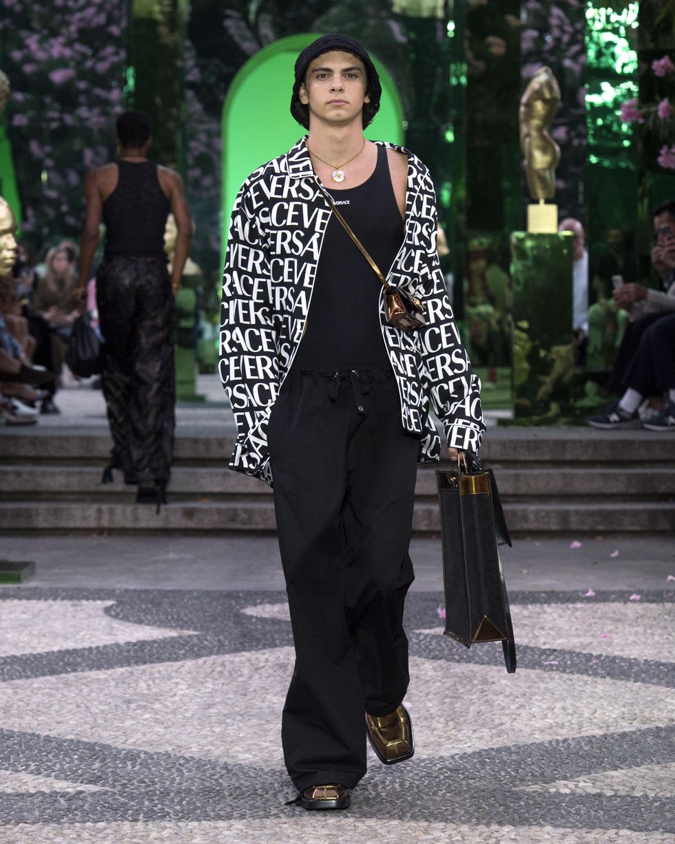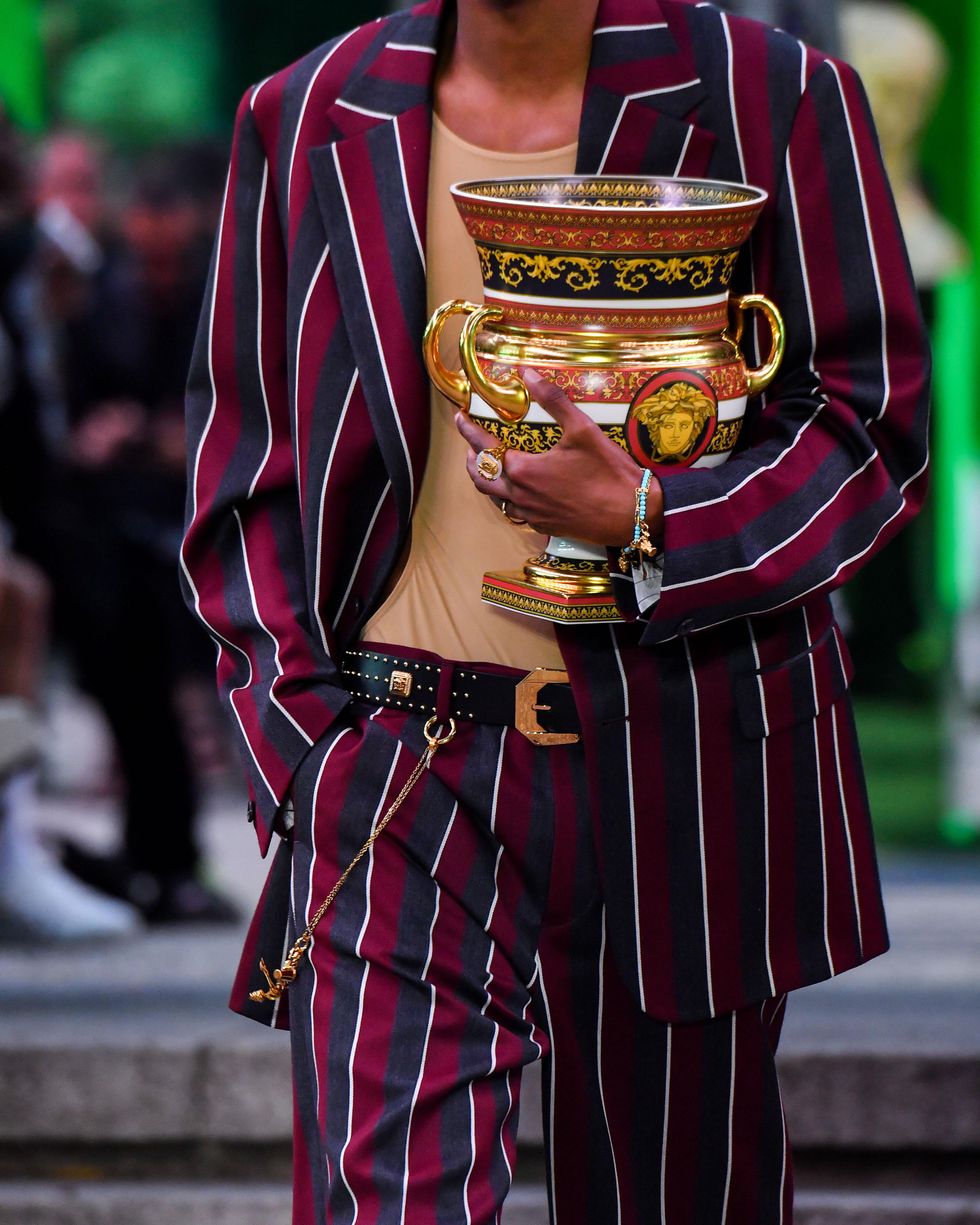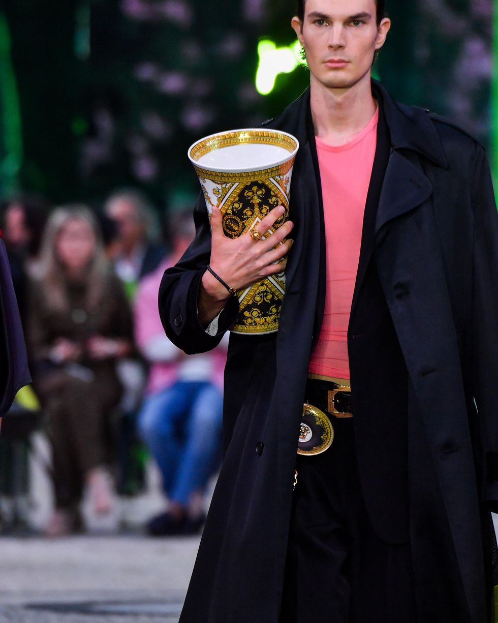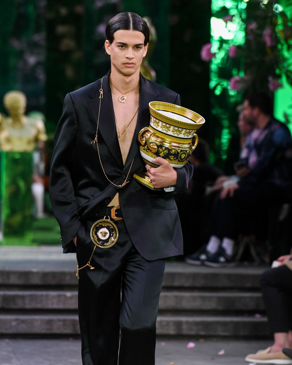 Speaking of Versace universe, the brand casually emphasized its other category — a home collection — thanks to a series of vases and urns that models carried in lieu of bags, all rendered in their signature baroque and Medusa prints. (Perhaps not coincidentally, the Salone di Mobile furniture fair, where tons of fashion brands were represented, just ran in Milan this month.)