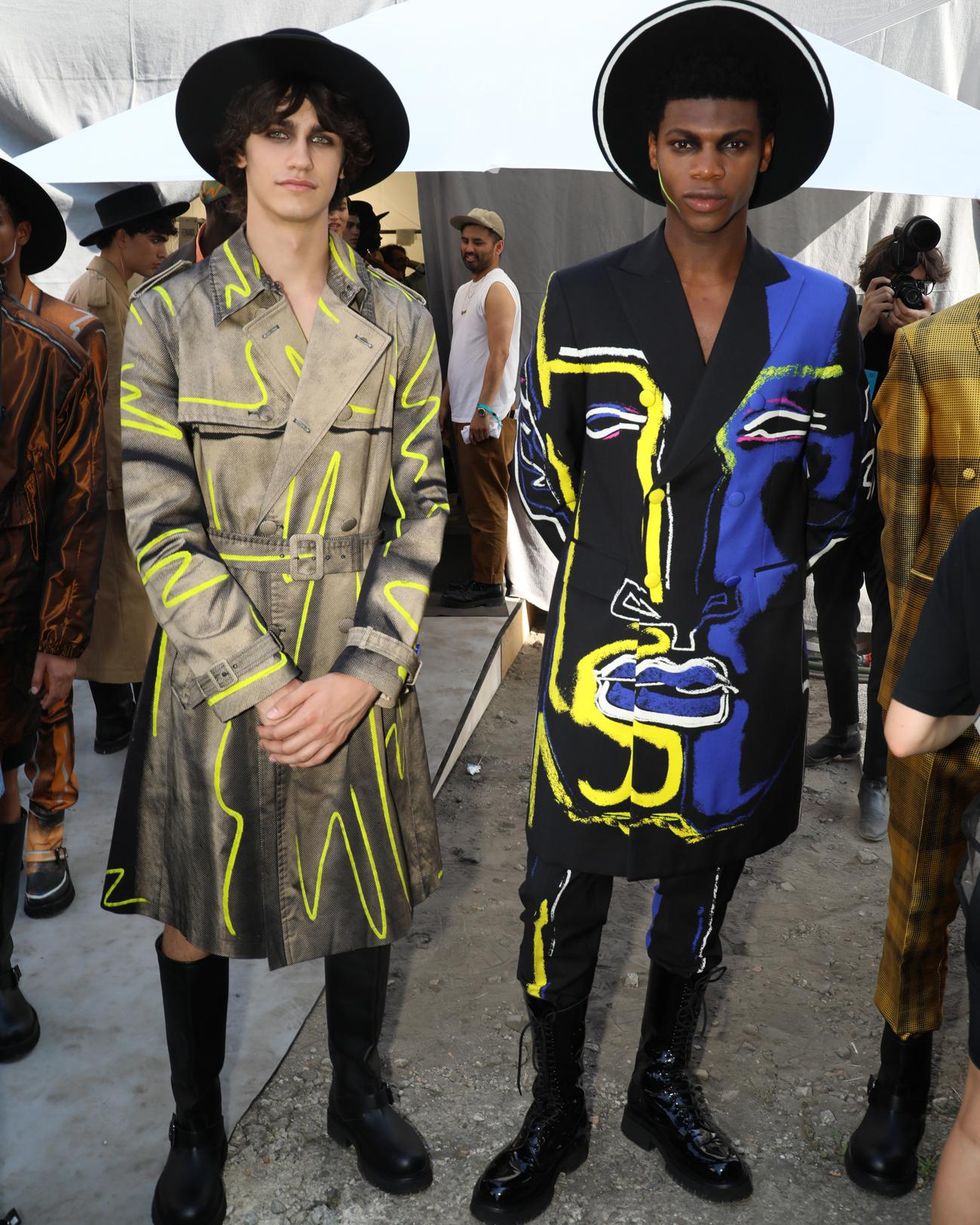 Plain and simple: Tony Viramontes. Jeremy Scott cited the late illustrator and his works as the focal point of the collection. He paid homage by collaborating with the artist's estate to produce the pieces featuring the motifs, faces and figures from Viramontes' pop-art colors and abstract squiggles. (The Buffalo styling movement of the '80s was another reference.)
