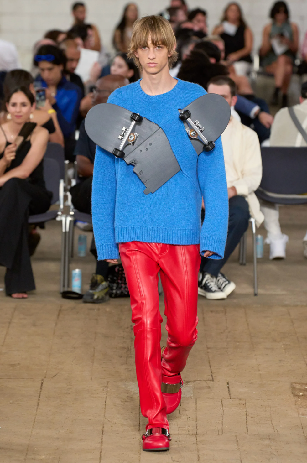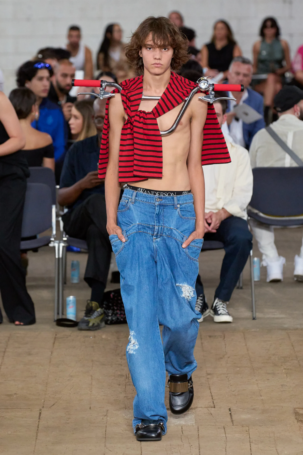 Broken skateboards, BMX handlebars, double jean waistbands, shattered CDs, barcodes, door hinges and safety gloves — all seemingly random items embedded into otherwise "normal" items like pullovers, distressed denim and baggy t-shirts in JW Anderson's bonkers menswear lineup (the women's Resort pieces were equally eclectic, particularly the Trompe-l'œil dresses/denimskirt hybrids). In Anderson's words: "Taking norms of everyday clothing and kind of mechanically putting them back together,” he tells WWD.
