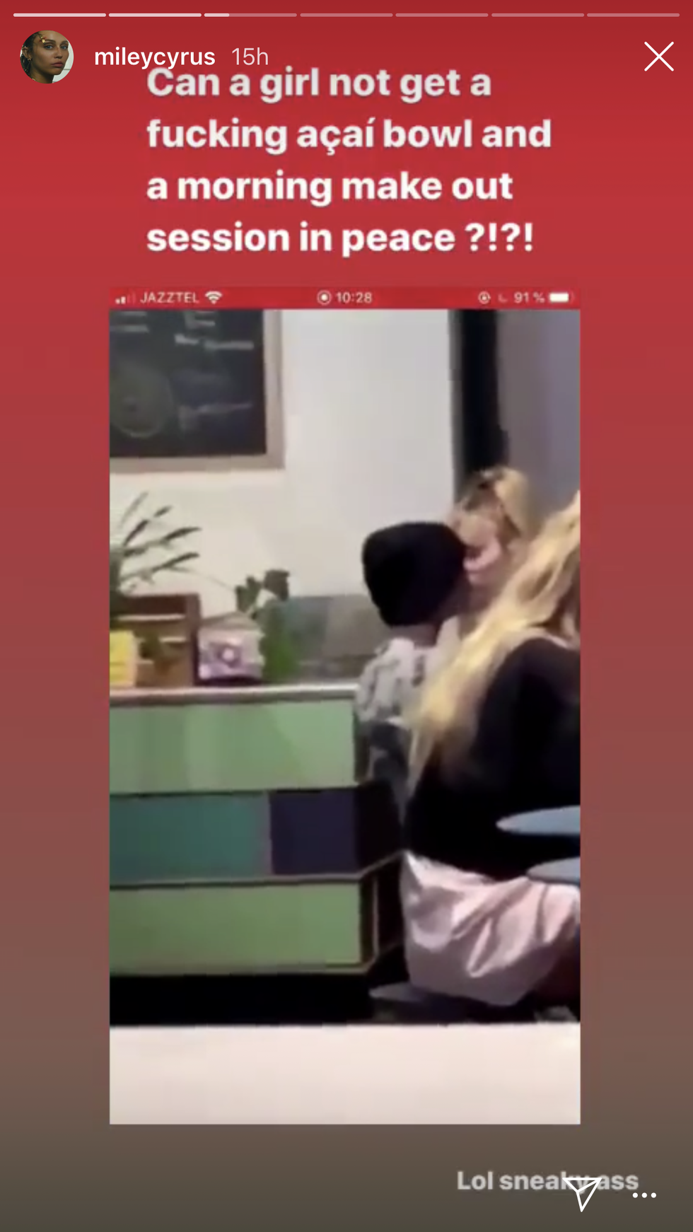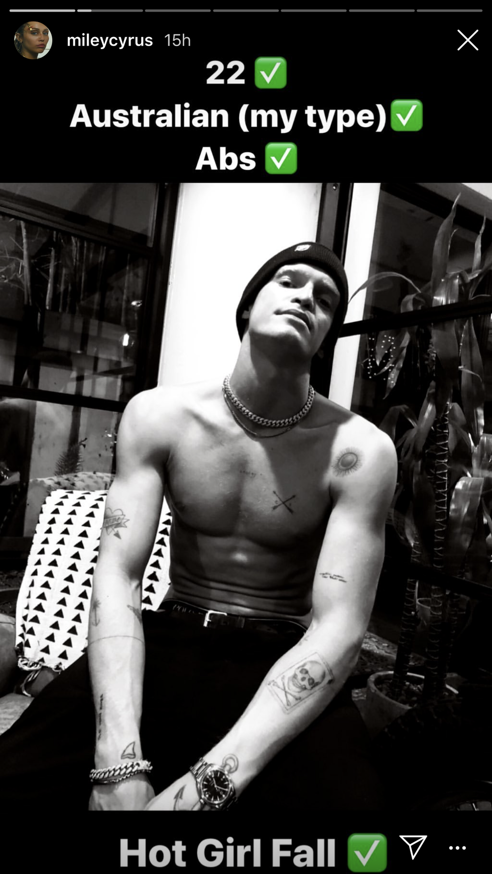 The "Slide Away" singer posted photos of Cody on her Instagram Stories, pointing out how the Aussie has a lot of great qualities, and could be anyone's crush. He's 22, Australian, has abs, and it's Hot Girl Fall, after all. Miley even reposts the footage TMZ got of her kissing with Cody, and wrote, "Can a girl not get a fucking açaí bowl and a morning make out session in peace ?!?!"
