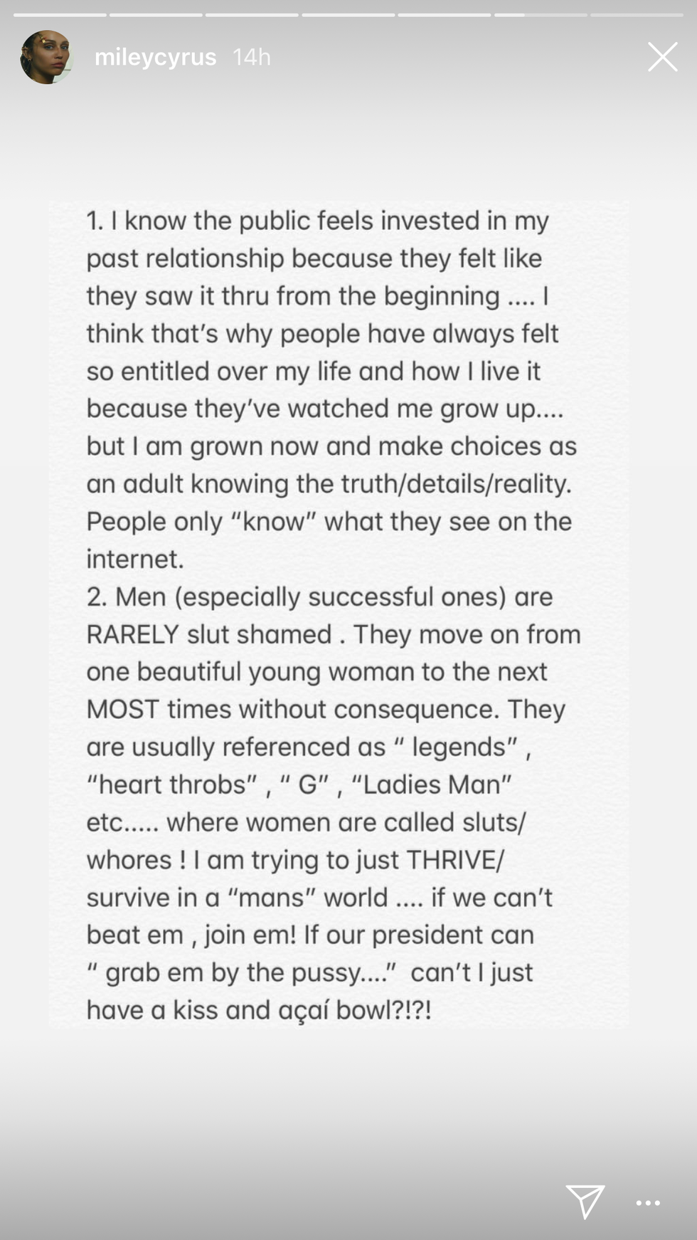 Beyond addressing the make out sesh, and giving us all a reason to maybe consider Cody as a new phone screensaver, Miley gets more serious and talks about the real issue at hand — why should people feel the need to be all up in her business? The performer writes, "I know the public feels invested in my past relationship because they felt like they saw it thru from the beginning." She continues, "But I am grown now and make choices as an adult knowing the truth/details/reality. People only 'know' what they see on the internet."
