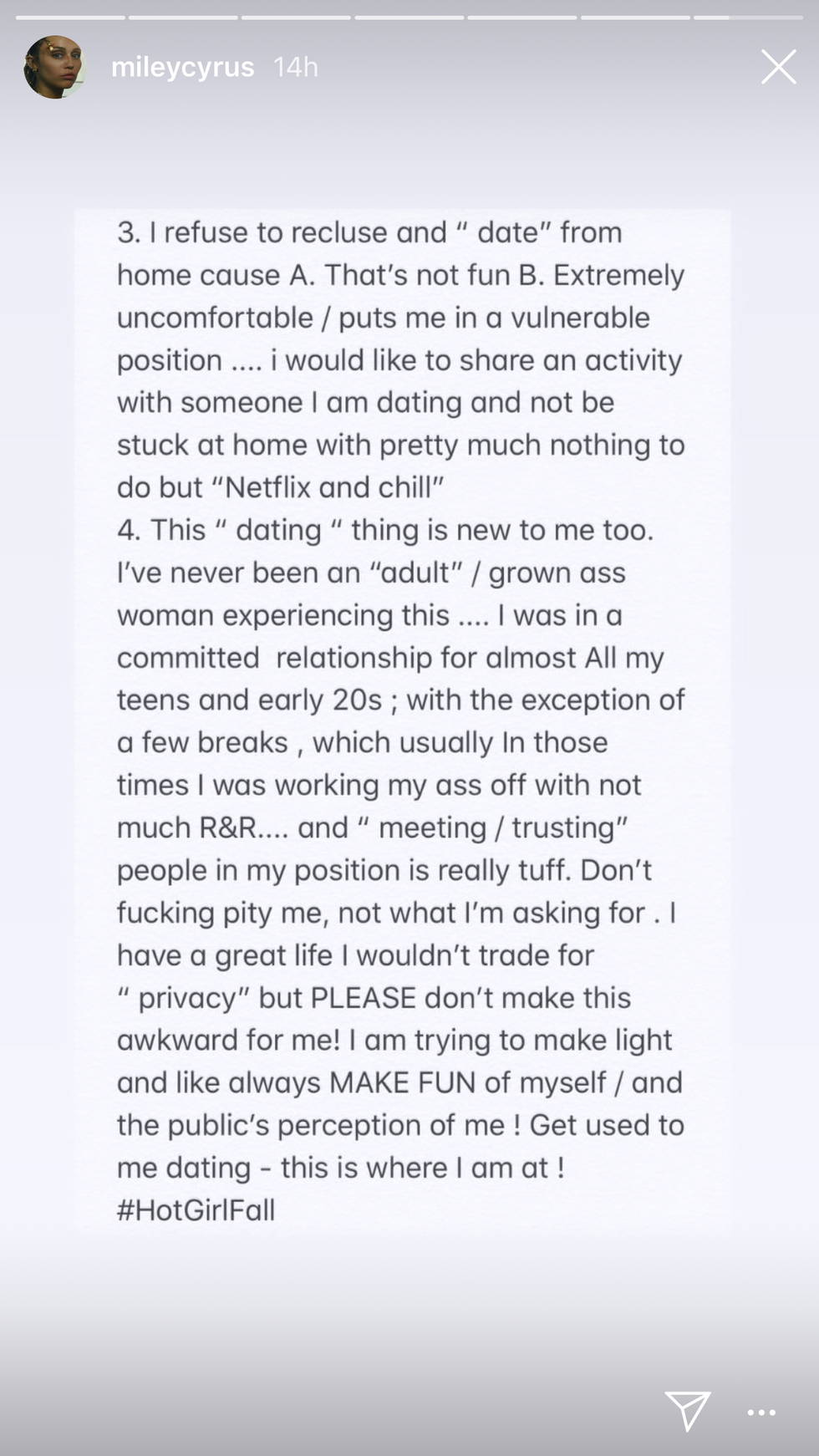 But Miley adds, "Don't fucking pity me, not what I'm asking for. I have a great life I wouldn't trade for 'privacy' but PLEASE don't make this awkward for me! I am trying to make light and like always MAKE FUN of myself/ and the public's perception of me! Get used to me dating — this is where I am at ! #HotGirlFall"