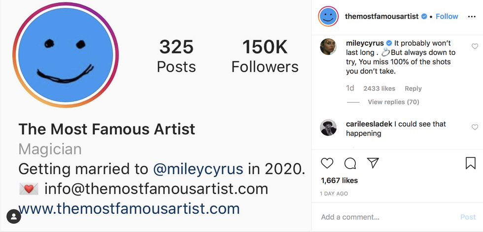 It all started after an artist known as Matty Mo, aka "The Most Famous Artist," took to his Instagram yesterday to make a joke about his plans to get married to Cyrus next year.