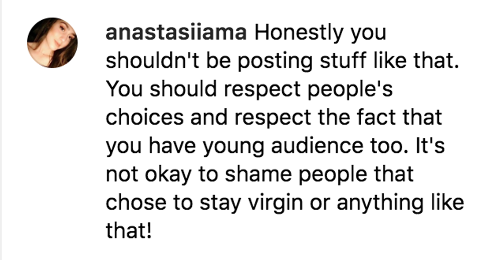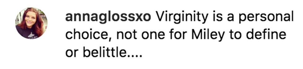 "There's nothing wrong with being a virgin," as one commenter wrote. "There's something very wrong with people who think being a virgin is a problem." Others proceeded to tell Cyrus to "respect people's choices" and even went so far as to accuse her of "shaming" virgins.
