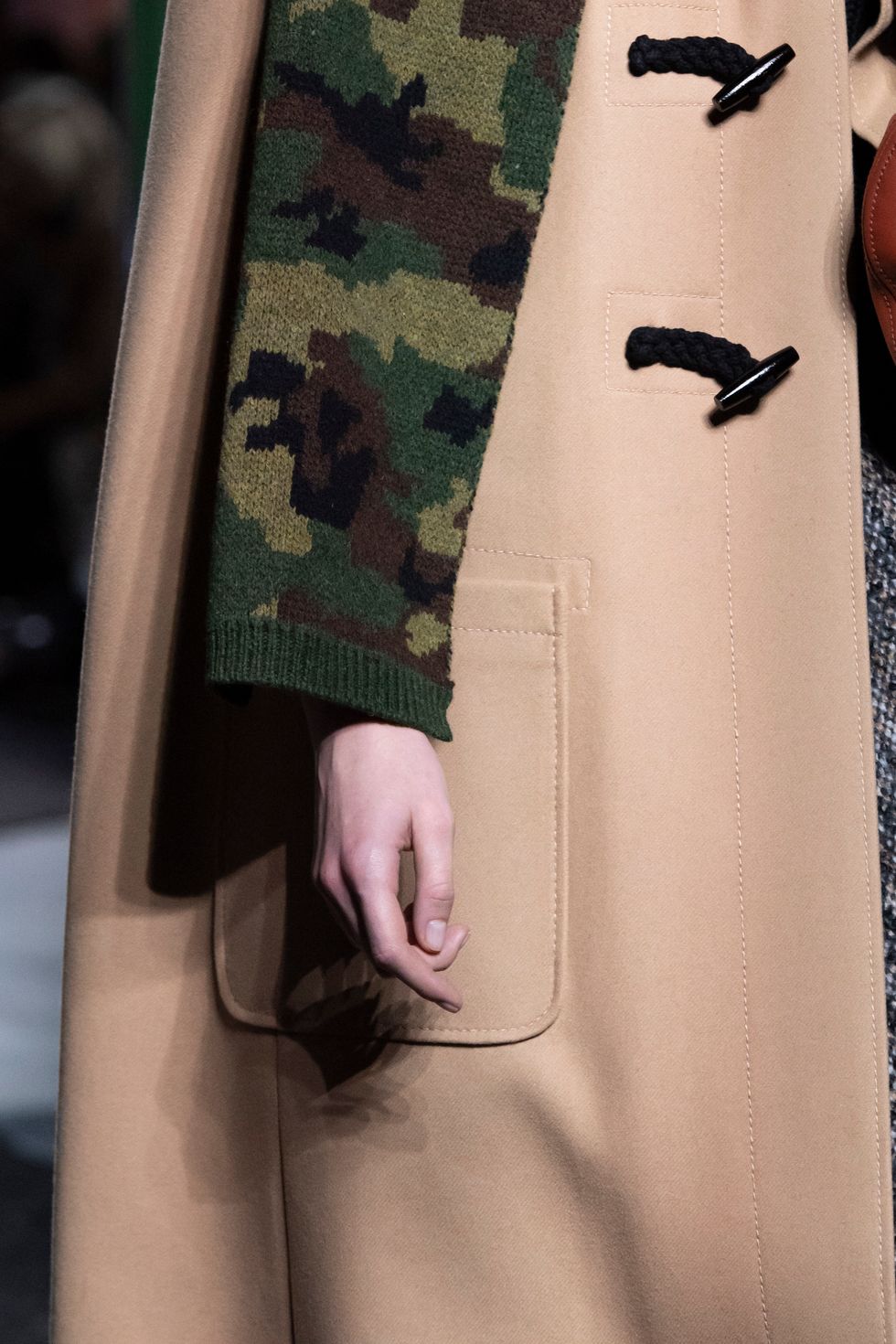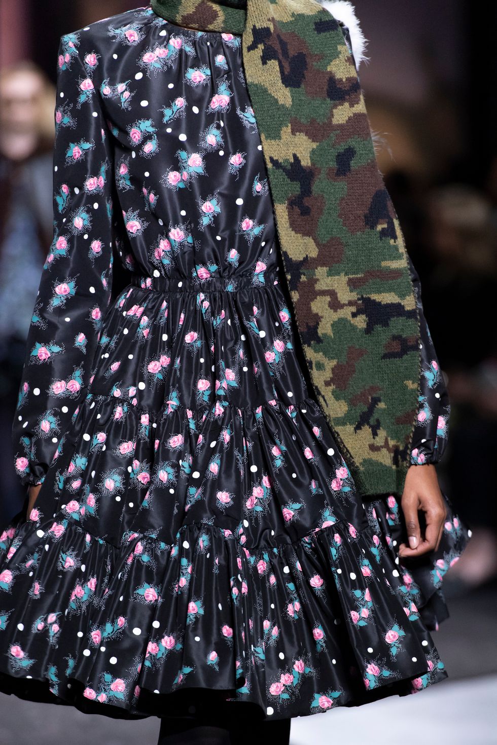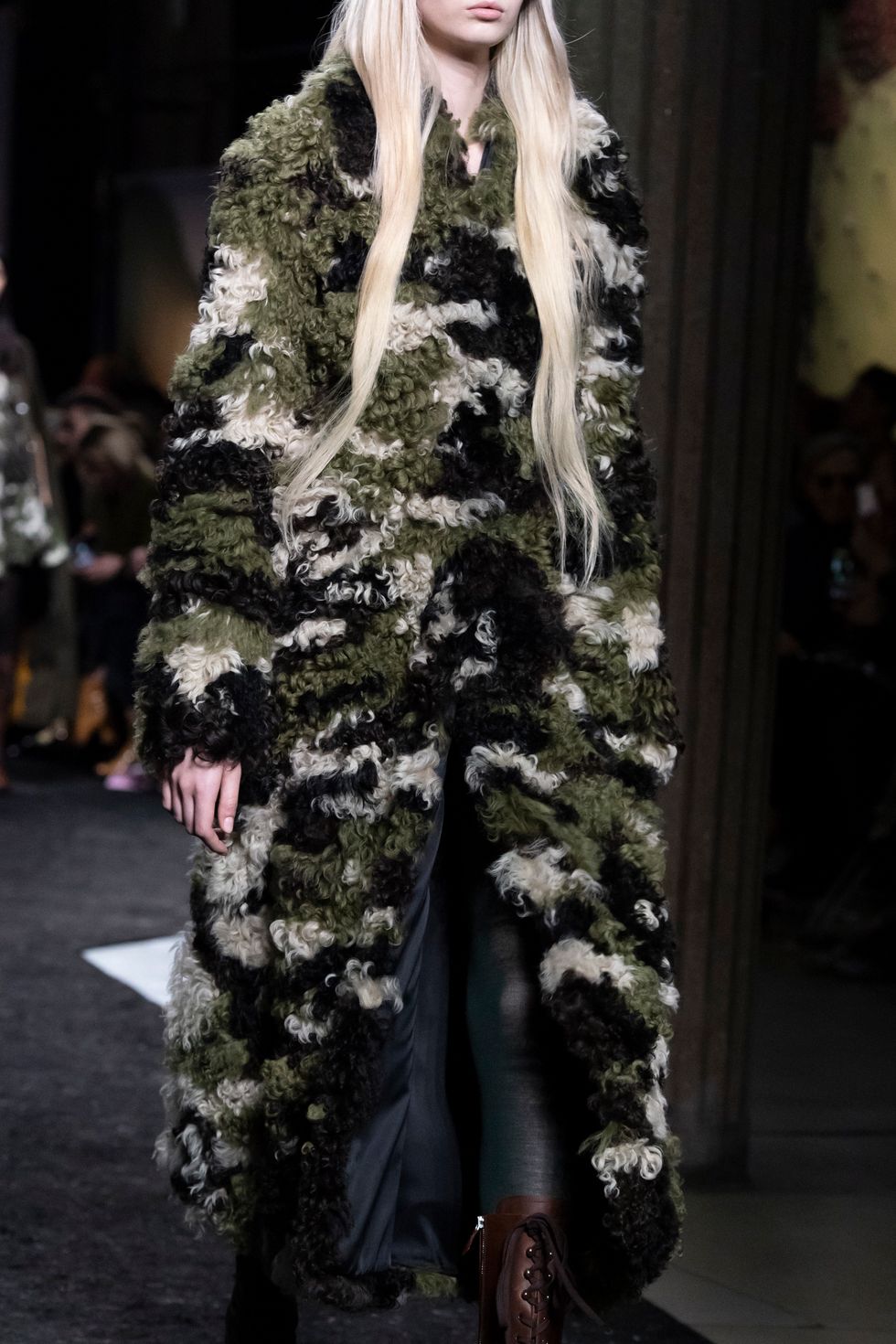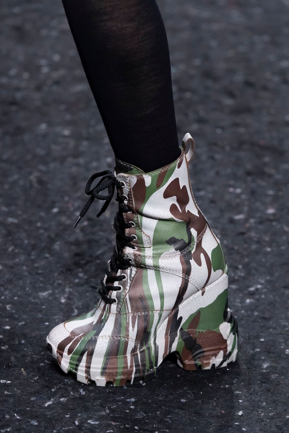 Camo was the winning print of the show. Scarves, dresses, sweaters, capes, even shorts – were covered in it. With the fall 2019 shows following a theme of modern armor for the contemporary world (See Marine Serre, or Comme des Garcons, for instance), this felt right at home. The chunky treaded platform boots featuring the print were also a standout.