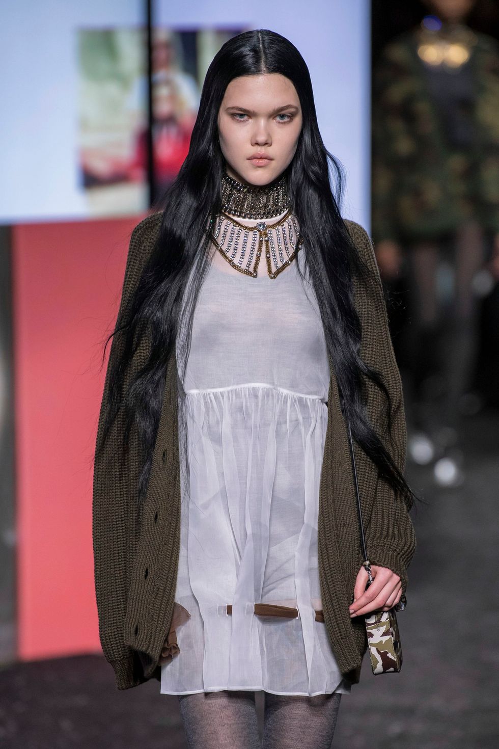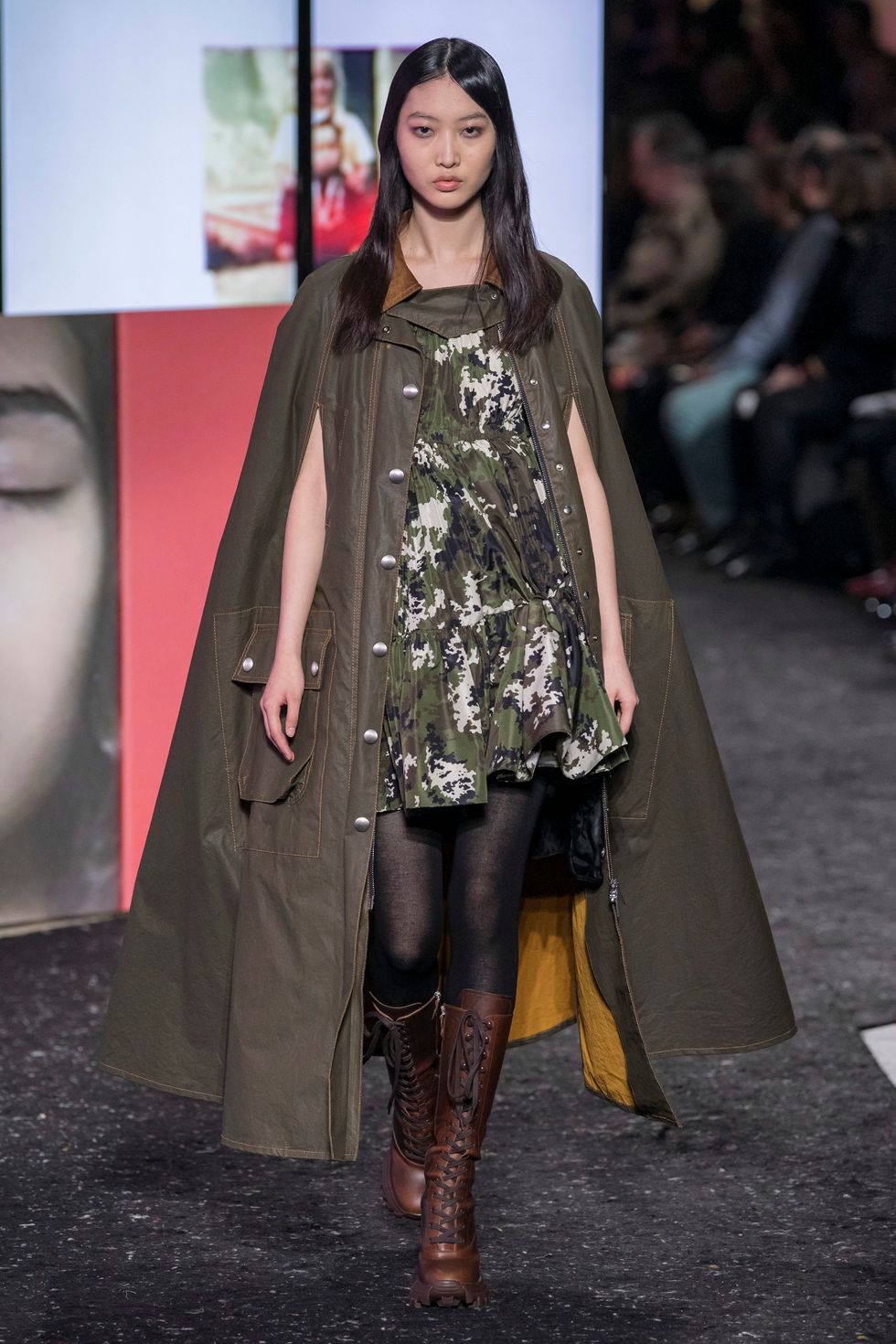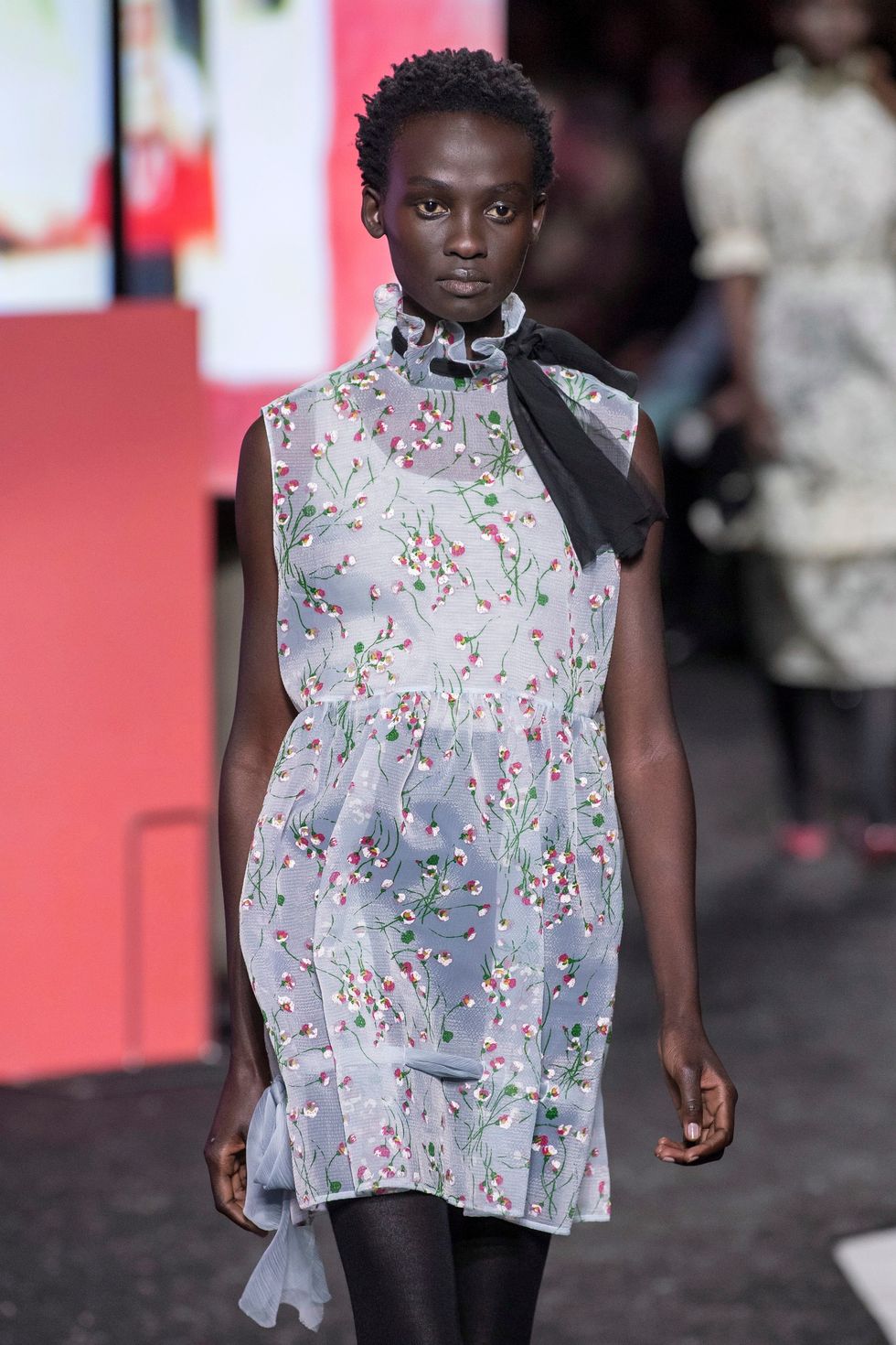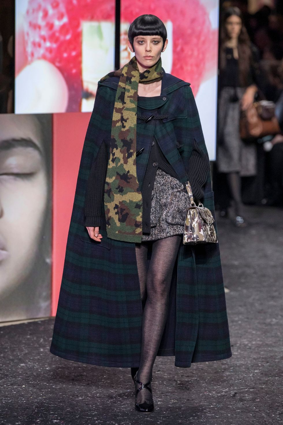 Camo was the winning print of the show. Scarves, dresses, sweaters, capes, even shorts – were covered in it. With the fall 2019 shows following a theme of modern armor for the contemporary world (See Marine Serre, or Comme des Garcons, for instance), this felt right at home. The chunky treaded platform boots featuring the print were also a standout.