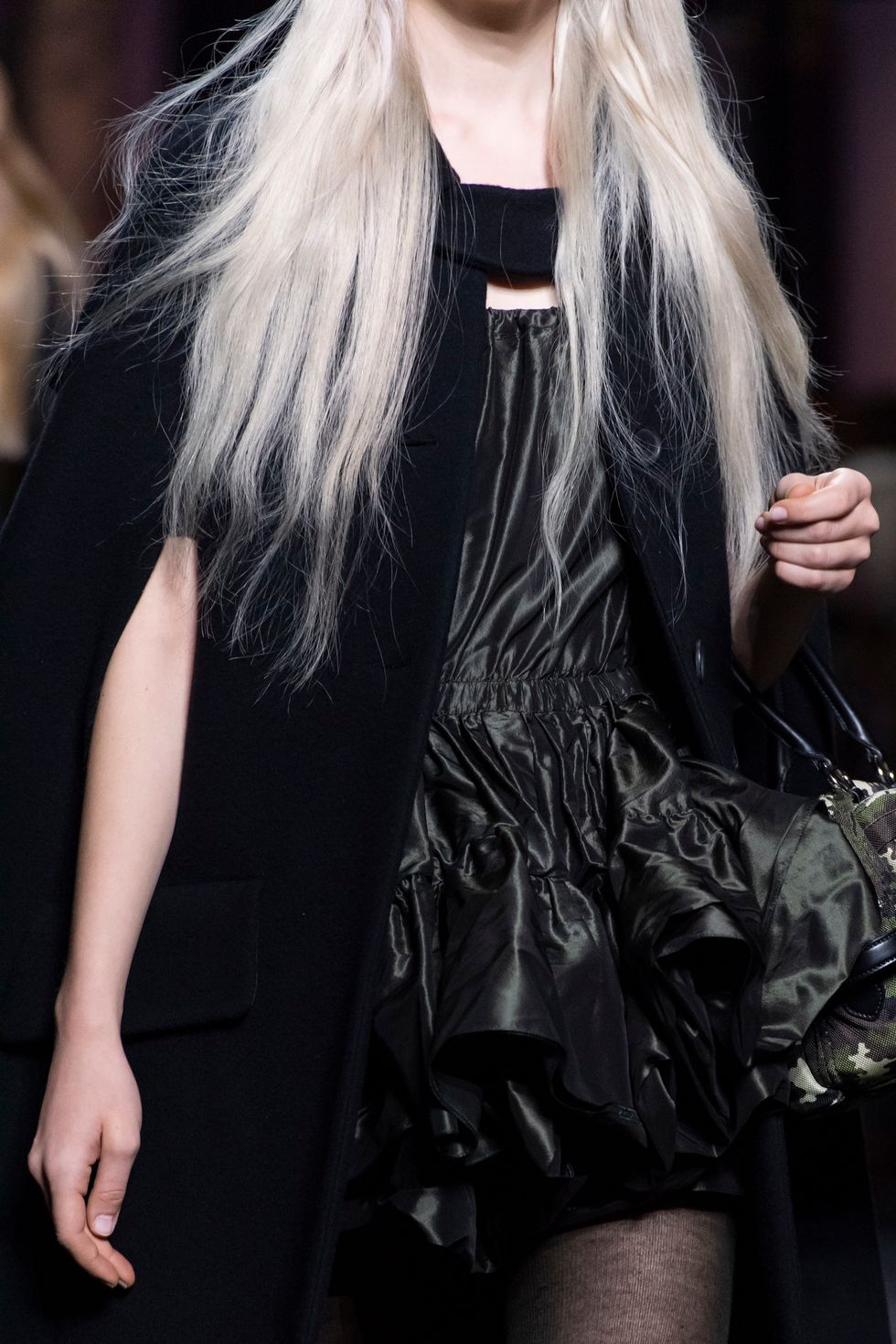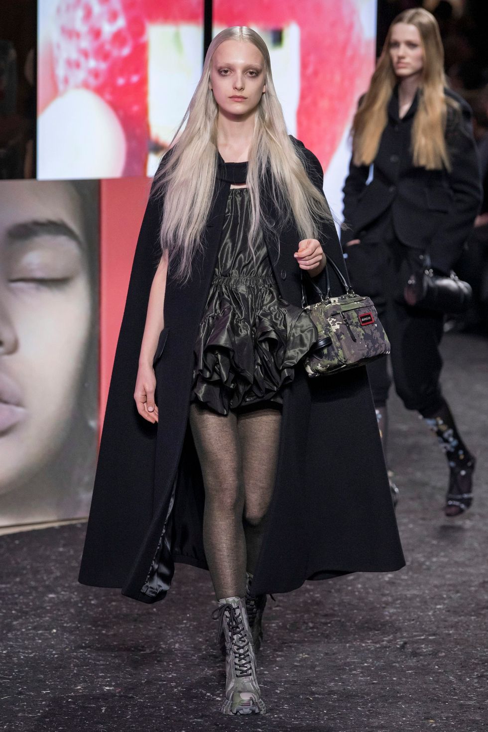 The defining coat shapes of the show came courtesy of the structured capes in navy wool and camouflage options. In velvet, with contrasting linings or done up in shearling, these shapes enhanced the fantasy fairy tale aesthetic of the collection and reminded us of a high fashion version of Little Red Riding Hood.