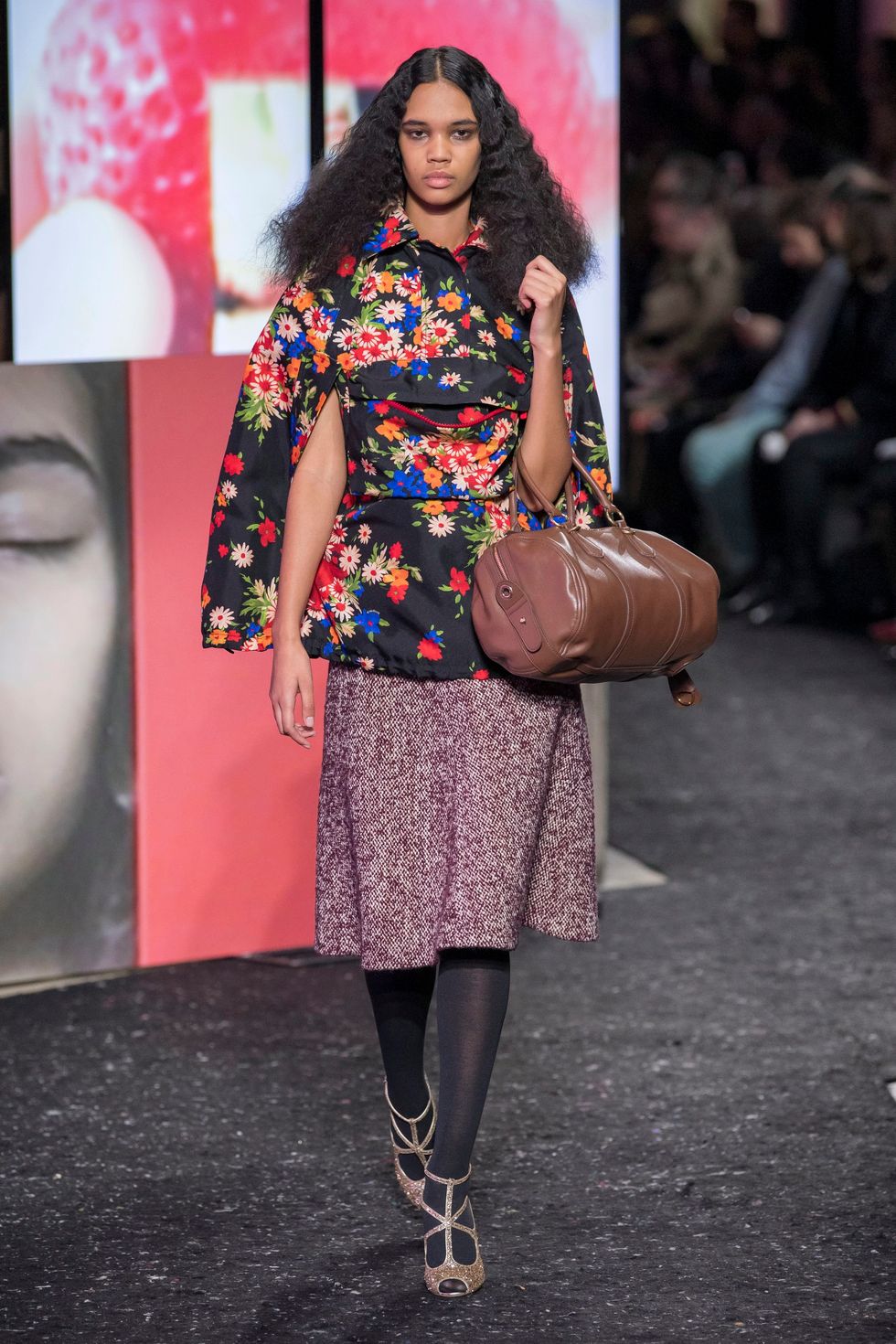 Little floral prints on tops, dresses and bags are what lent a '70s aesthetic to the collection, along with long center parted hair and smaller sunglasses frames. Crochet and chunky shearling were also possibly references to the decade.