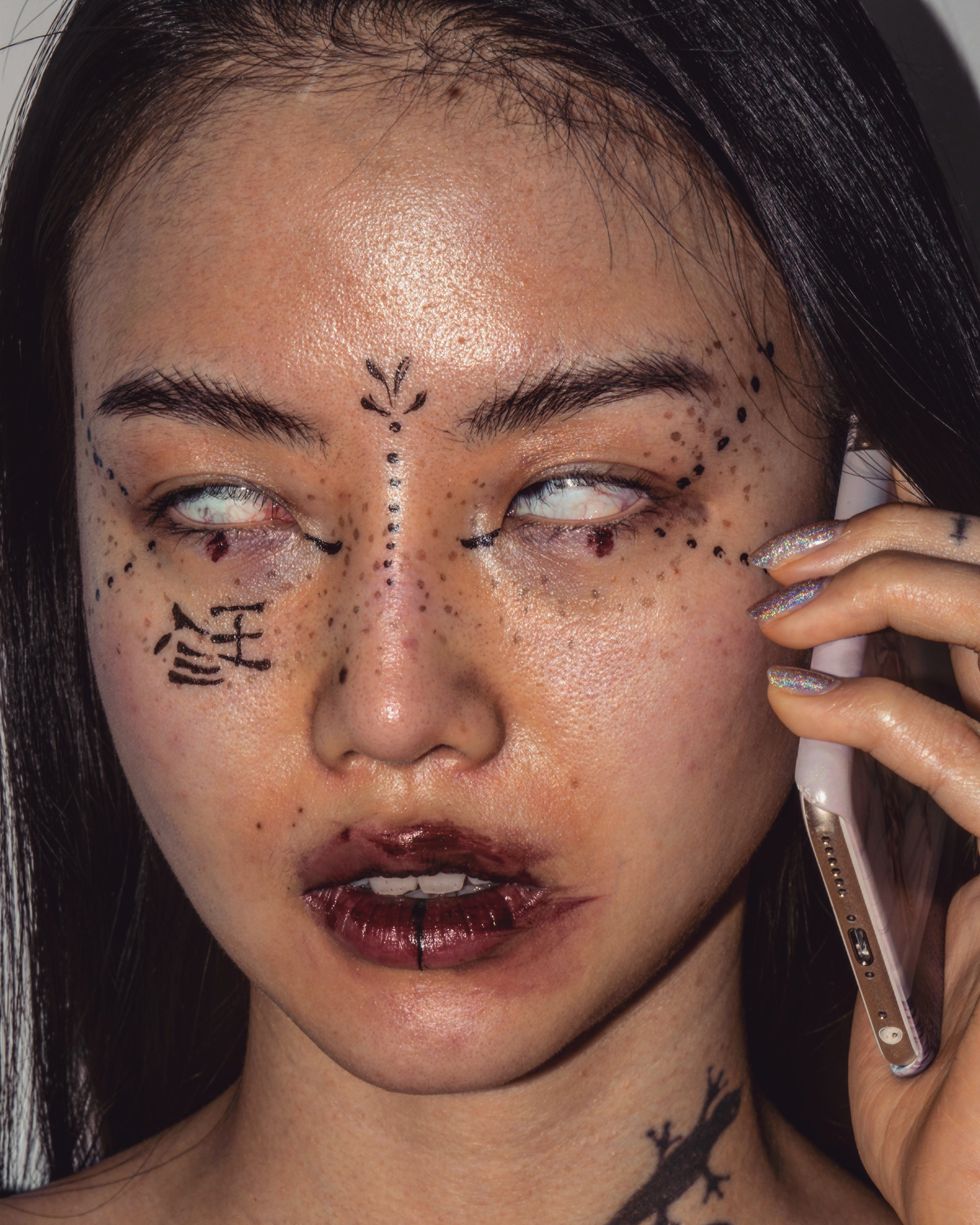 The intricacy of the flowers on her face alone implies thoughtful consideration; that Korean artist MLMA pairs the delicate blooms with blurred lips and messy brows suggests strategy. While immediately striking, there is a rawness in that particular image, too — and it's because it wasn't totally planned. "When an idea comes to mind, I do it. I never squeeze my head too hard to get my art," MLMA tells us.