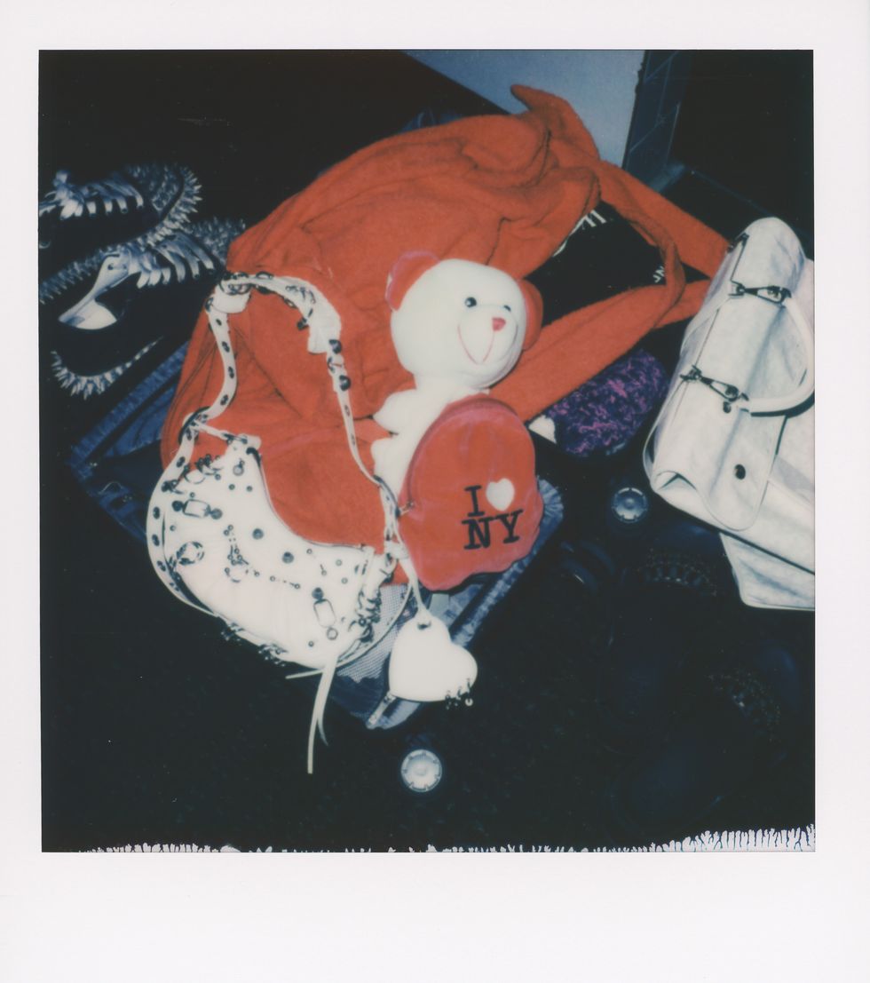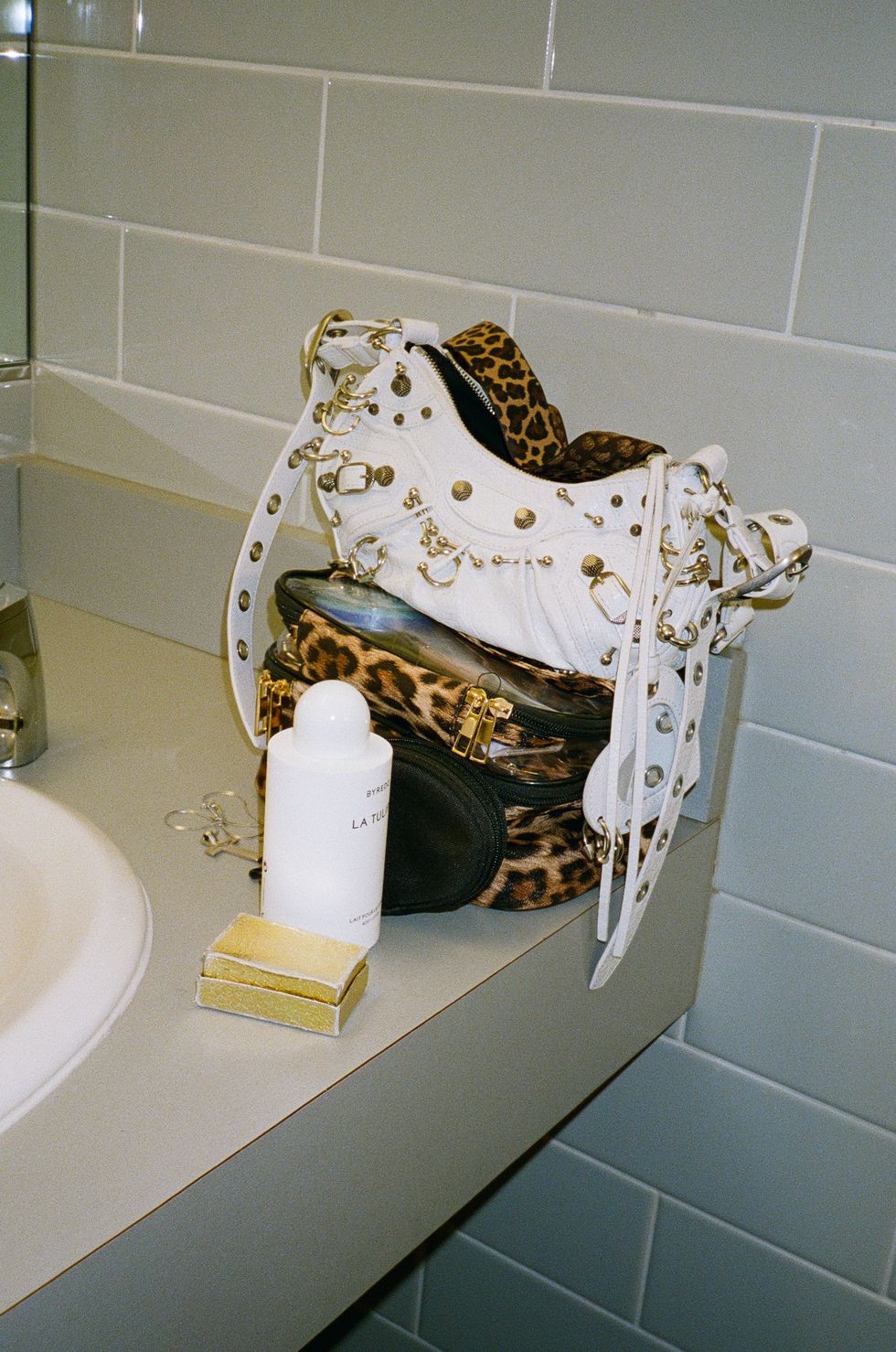 All my little tingz. My favorite pierced Balenciaga handbag with my matching white Goyard backpack, the most cutest and comfortable Givenchy slides, my new fave spiked Doublet sneakers and the I <3 NY teddy bear backpack I wore on stage.
