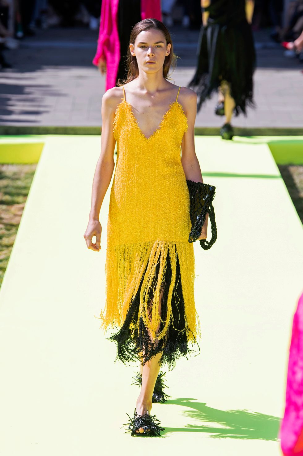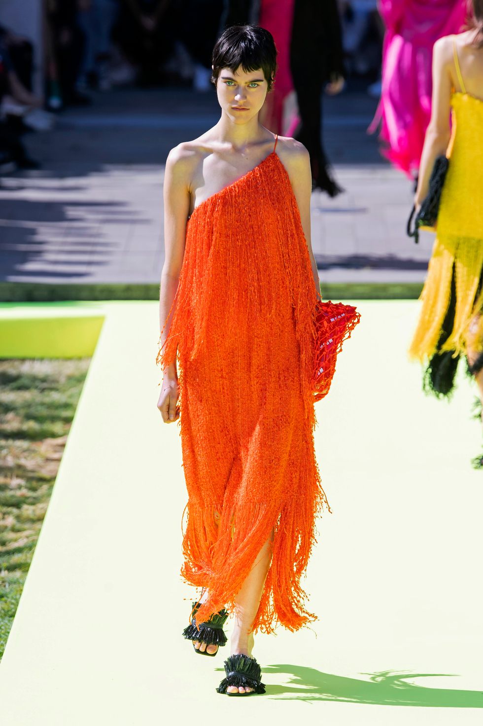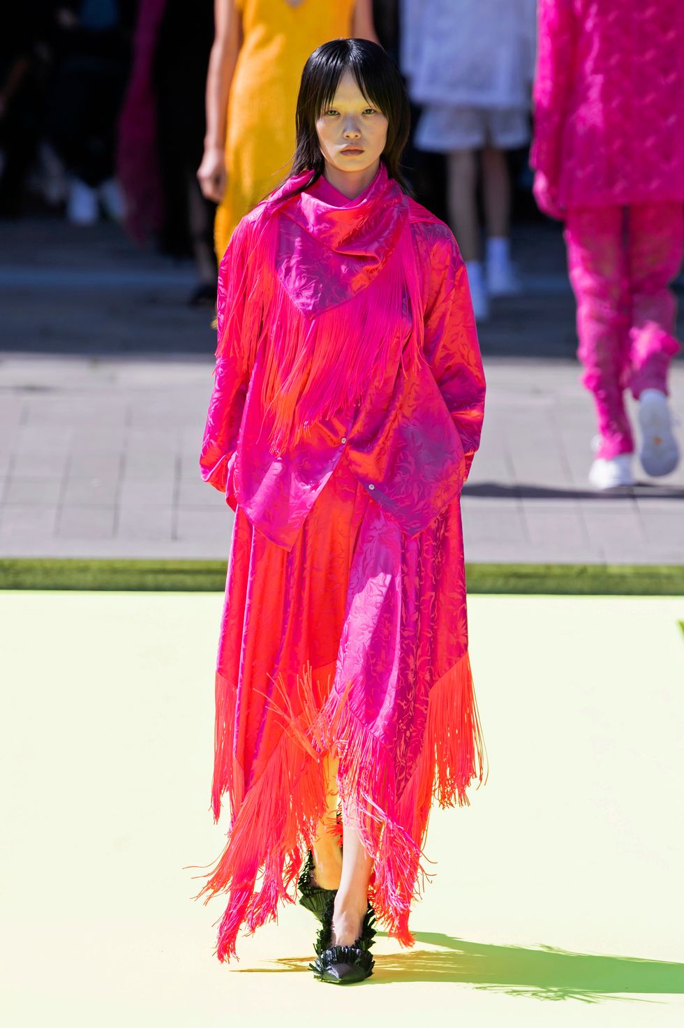 Sweeping layers of fringe is fast becoming one of the biggest trends in Milan, and MSGM approach it with the same dramatic flair but in eye-catching colors.