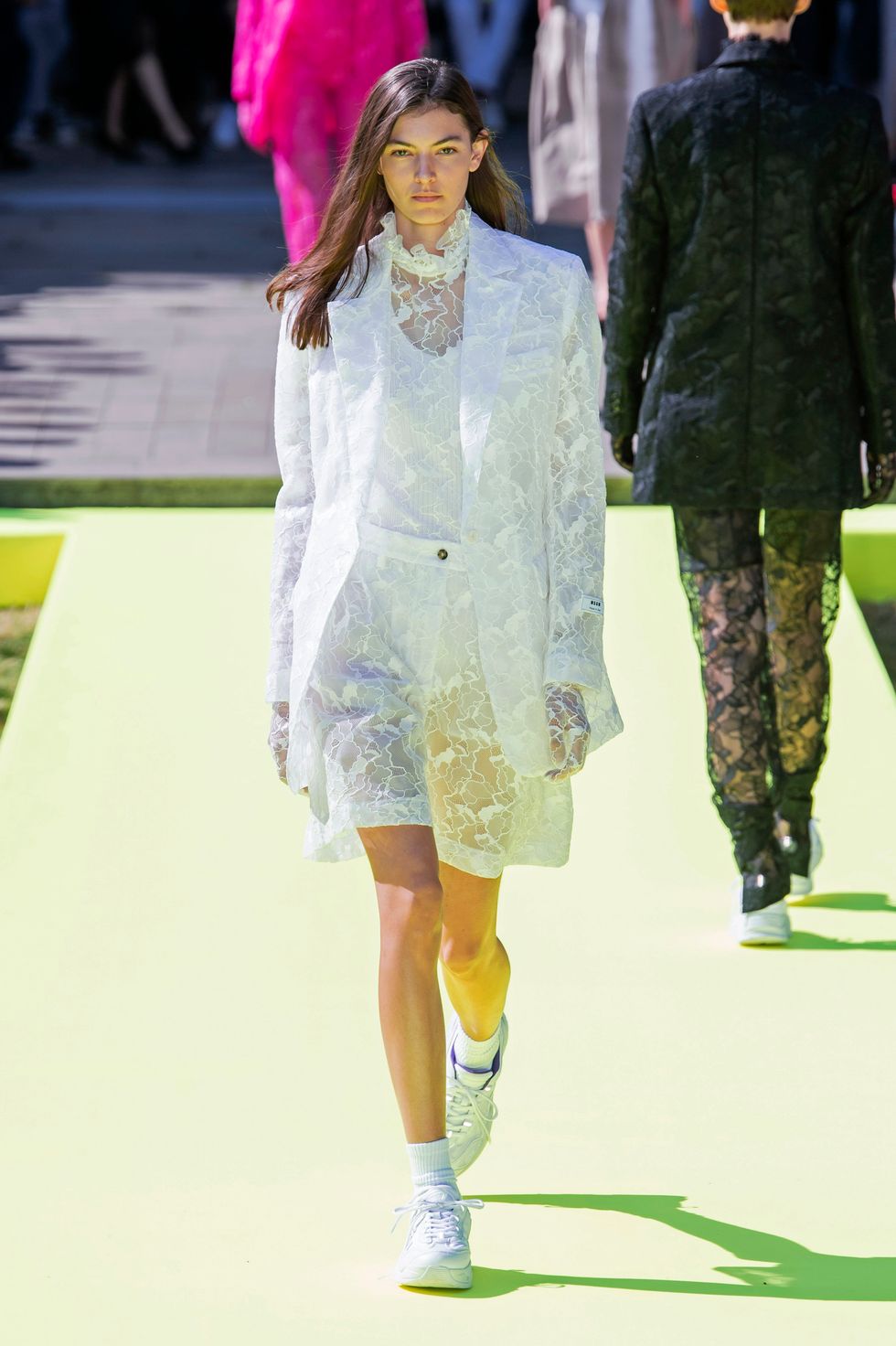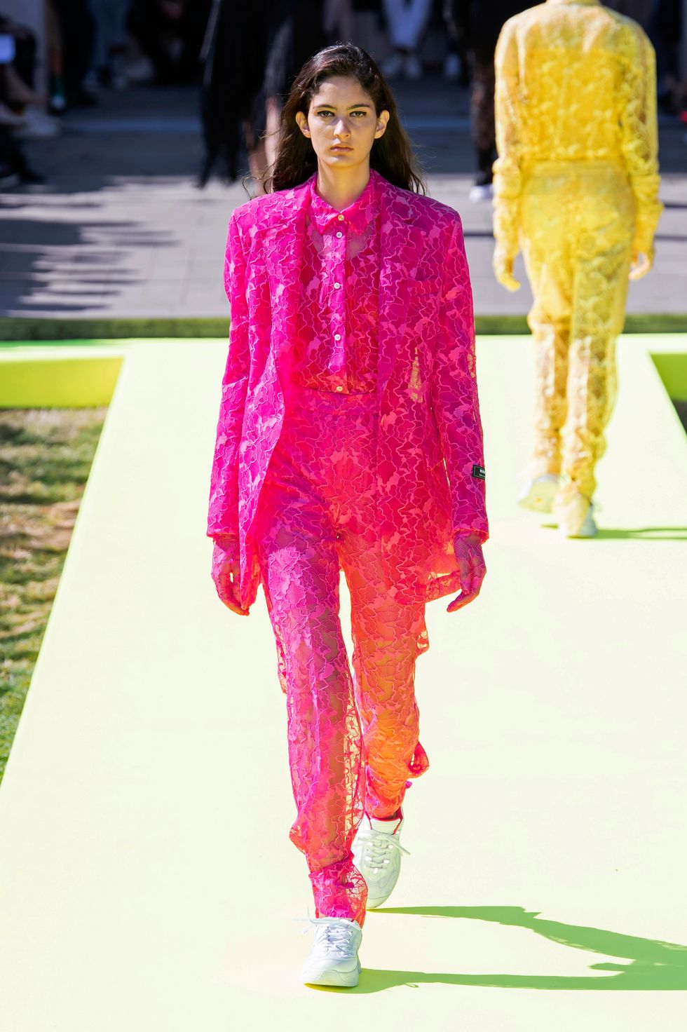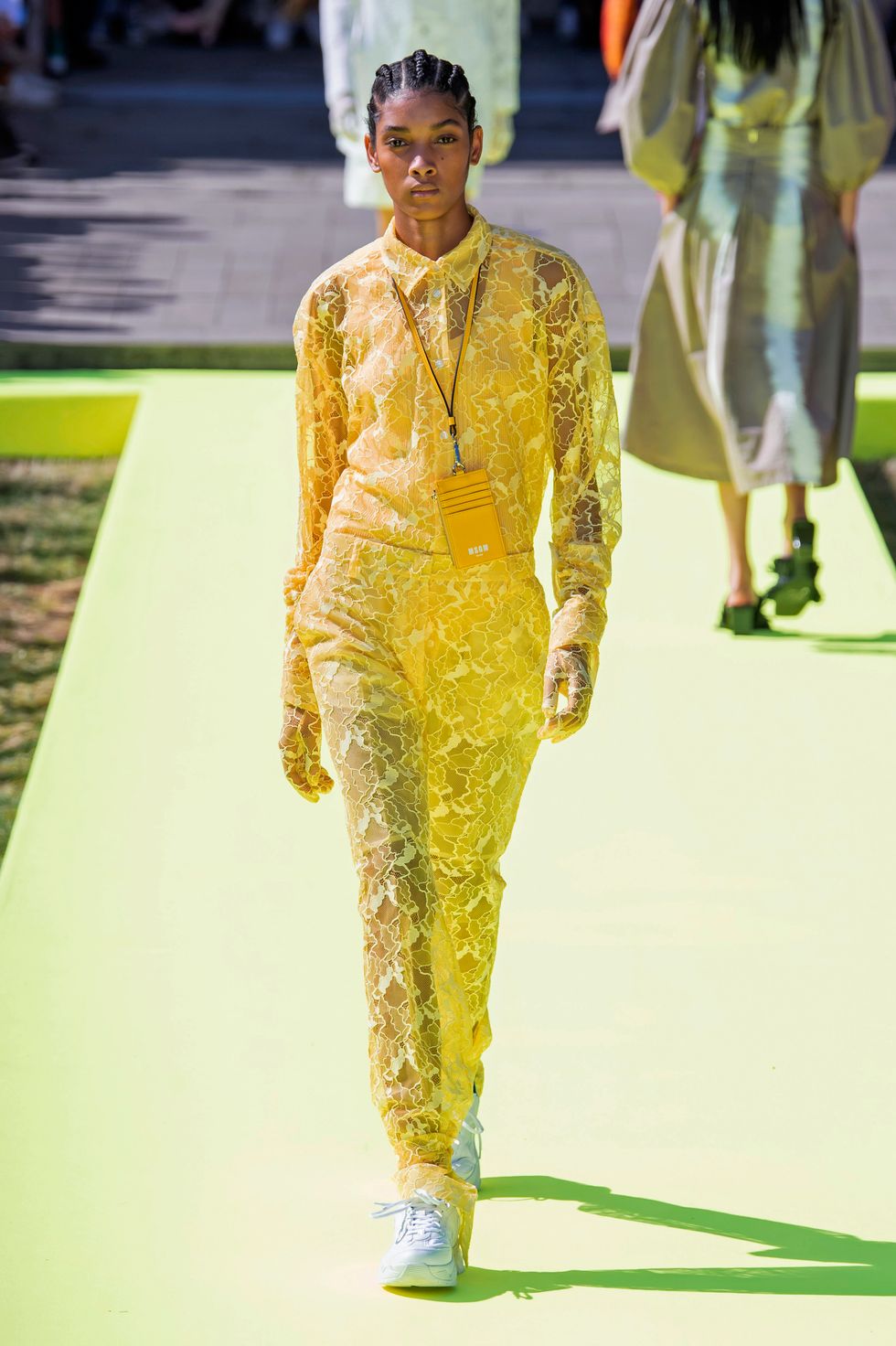 For spring, MSGM is proposing you wear suits made from colorful lace in pure white, hot pink, and bold canary yellow.
