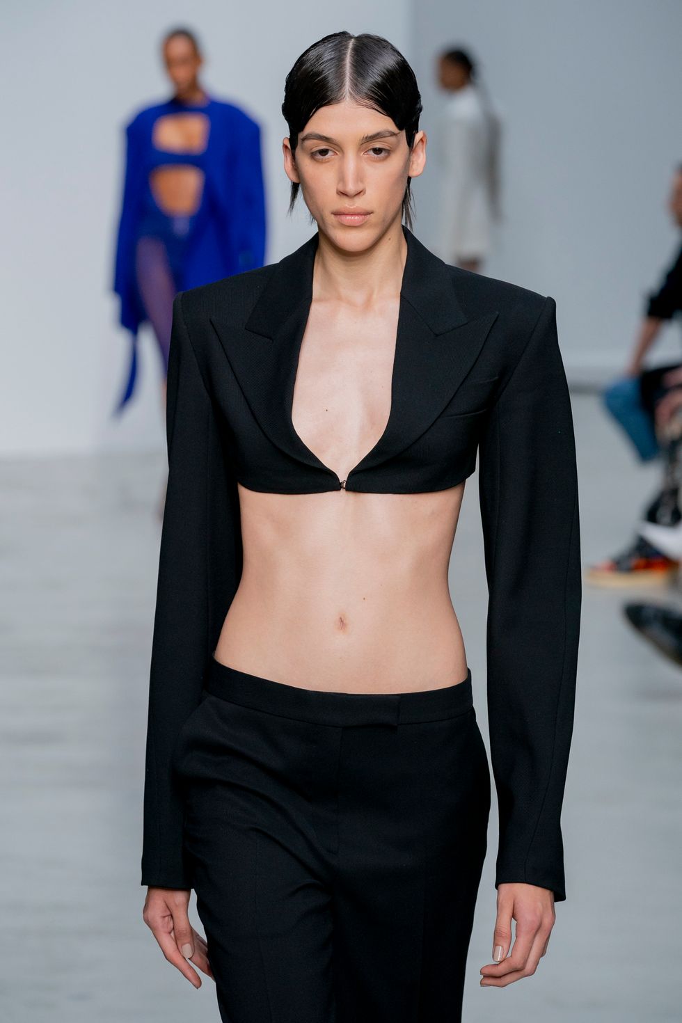 A big focus for Mugler this season was experimenting with traditional tailoring and giving it a sexy, dark edge. This resulted cropped jackets cut high up the rib cage leaving an exposed torso, held together only with a small hidden closure.
