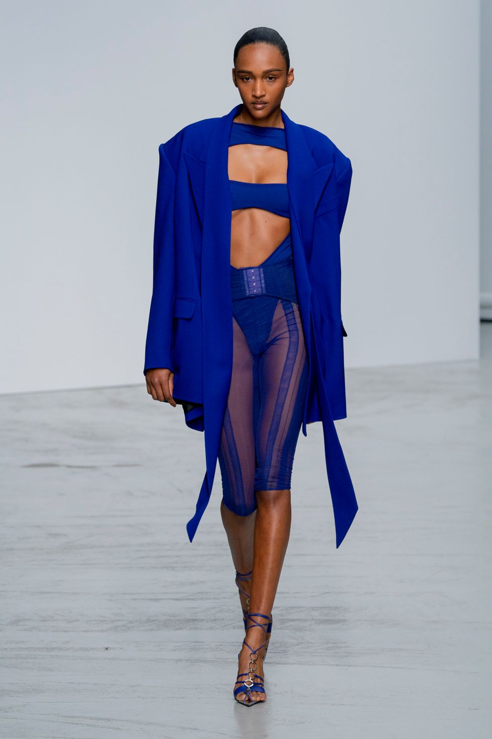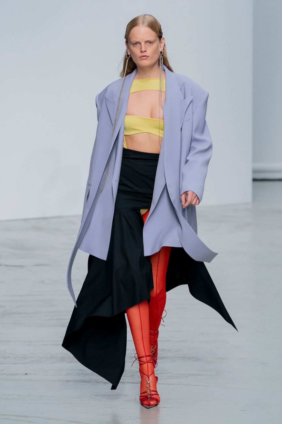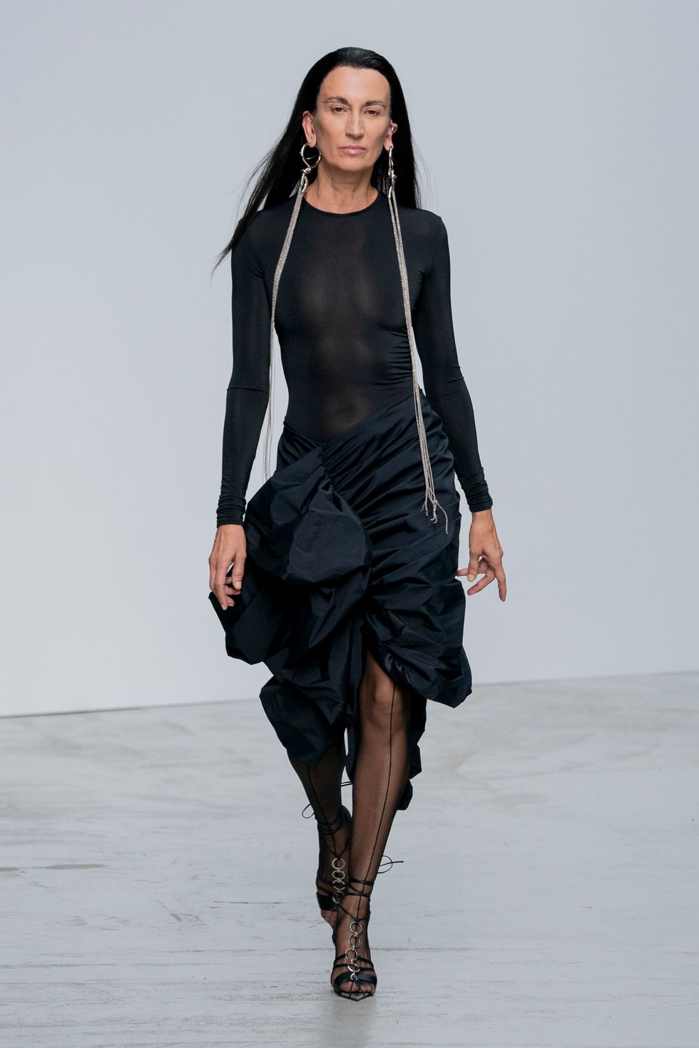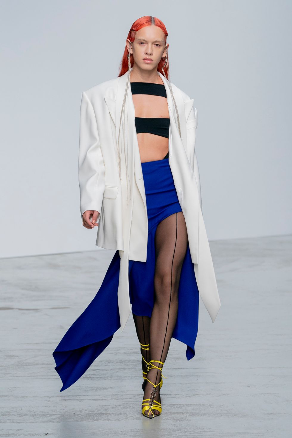 For the opening of Mugler's Spring 2020 show in Paris, Bella Hadid emerged in one of the most show-stopping looks yet — a cropped blazer with a sheer corset and black stockings, no pants in sight. It set the tone for a collection that doubled down on the brand's signature sexy tailoring and dress-making, with exposed torsos, thigh-high slits and plunging necklines incorporated throughout. The casting was also commendable for its diverse mix of body types, ages, and ethnicities. (It's not often you'll see Hadid, Kembra Pfahler and Debra Shaw on the same runway.) Here's everything else you need to know about the Casey Cadwallader-designed collection.