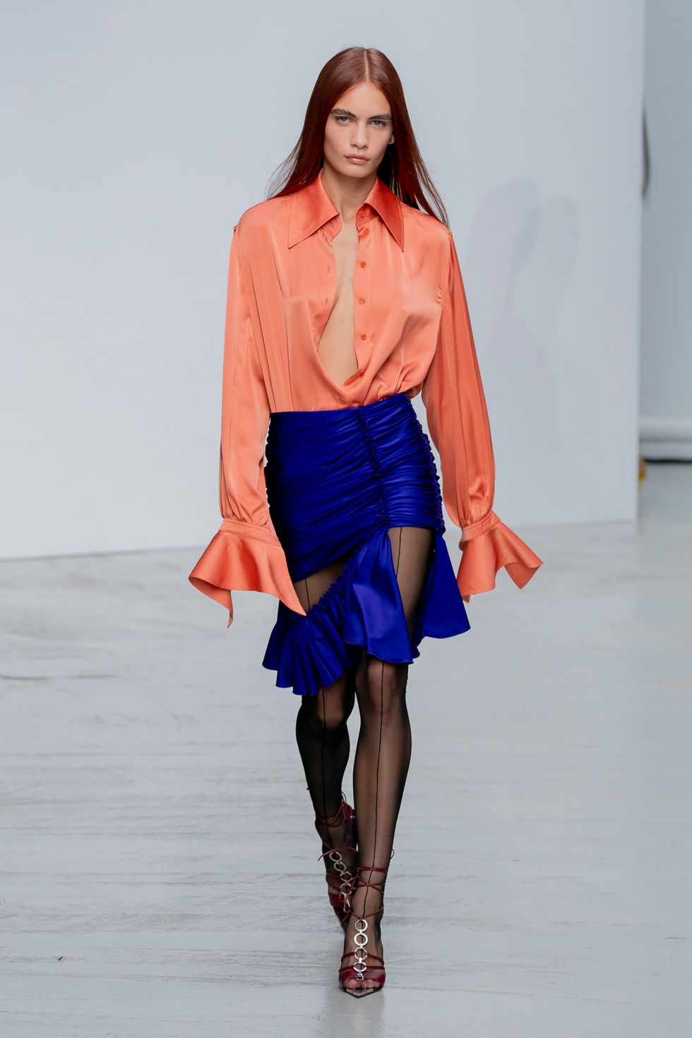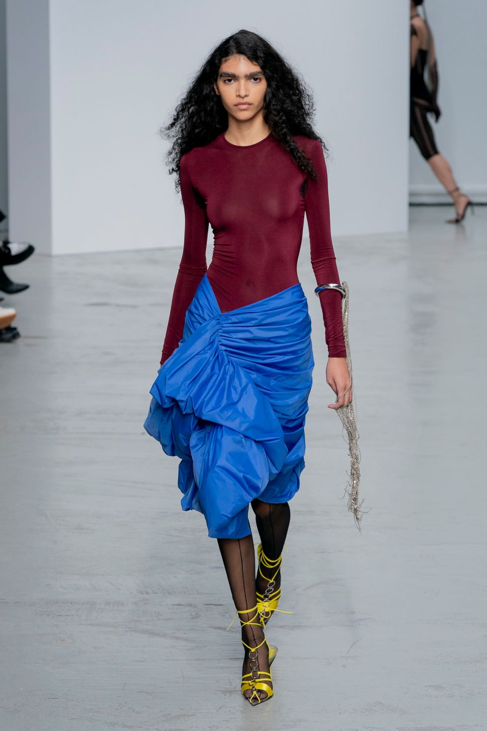 Another '80s reference were the ruffled, ruched skirts that hung low on the hips in crinkly fabrics.