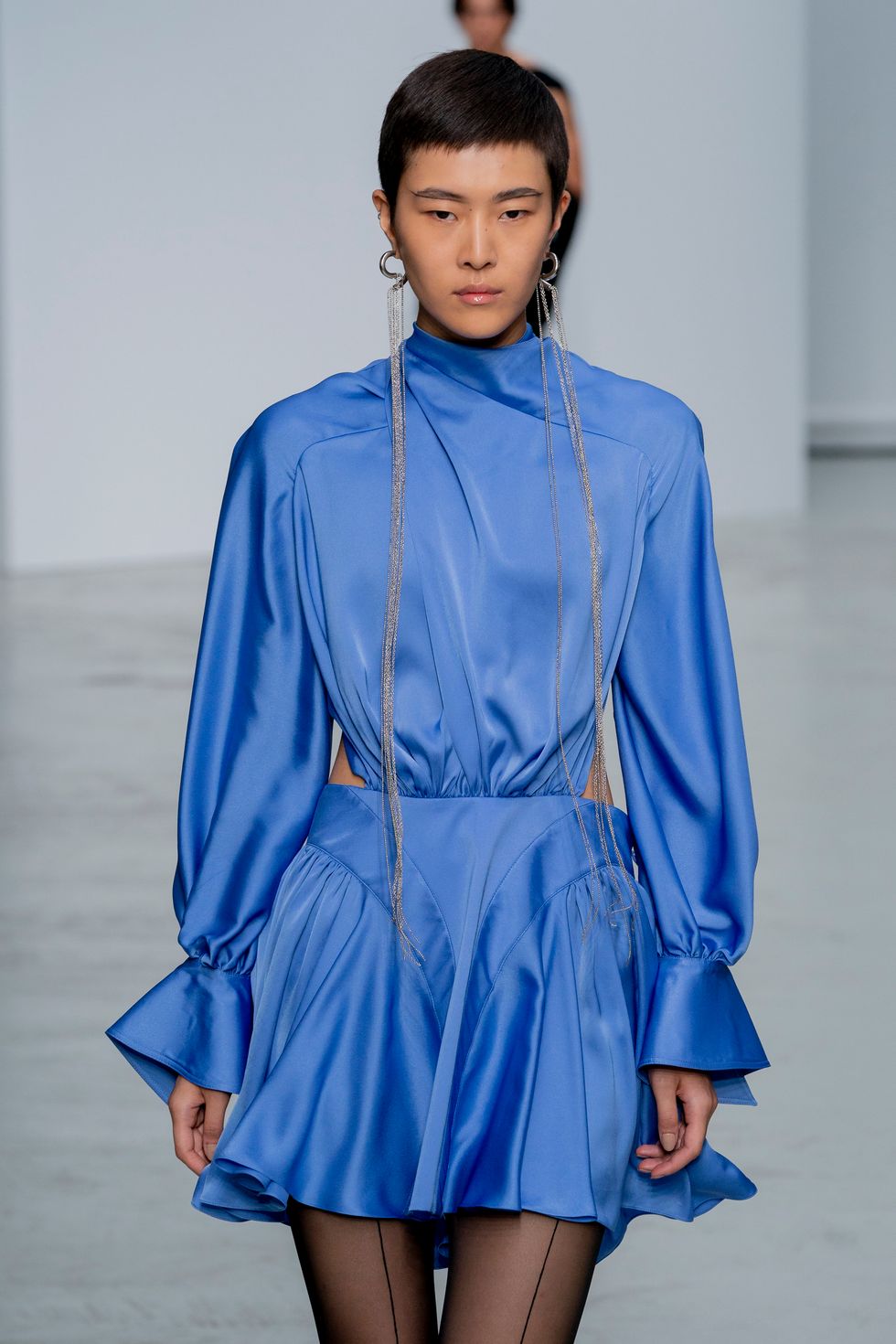 Dresses and shirts, whether sheer or rendered in glossy satin, featured elongated sleeves with a distinct flute cuff that flared out wide.