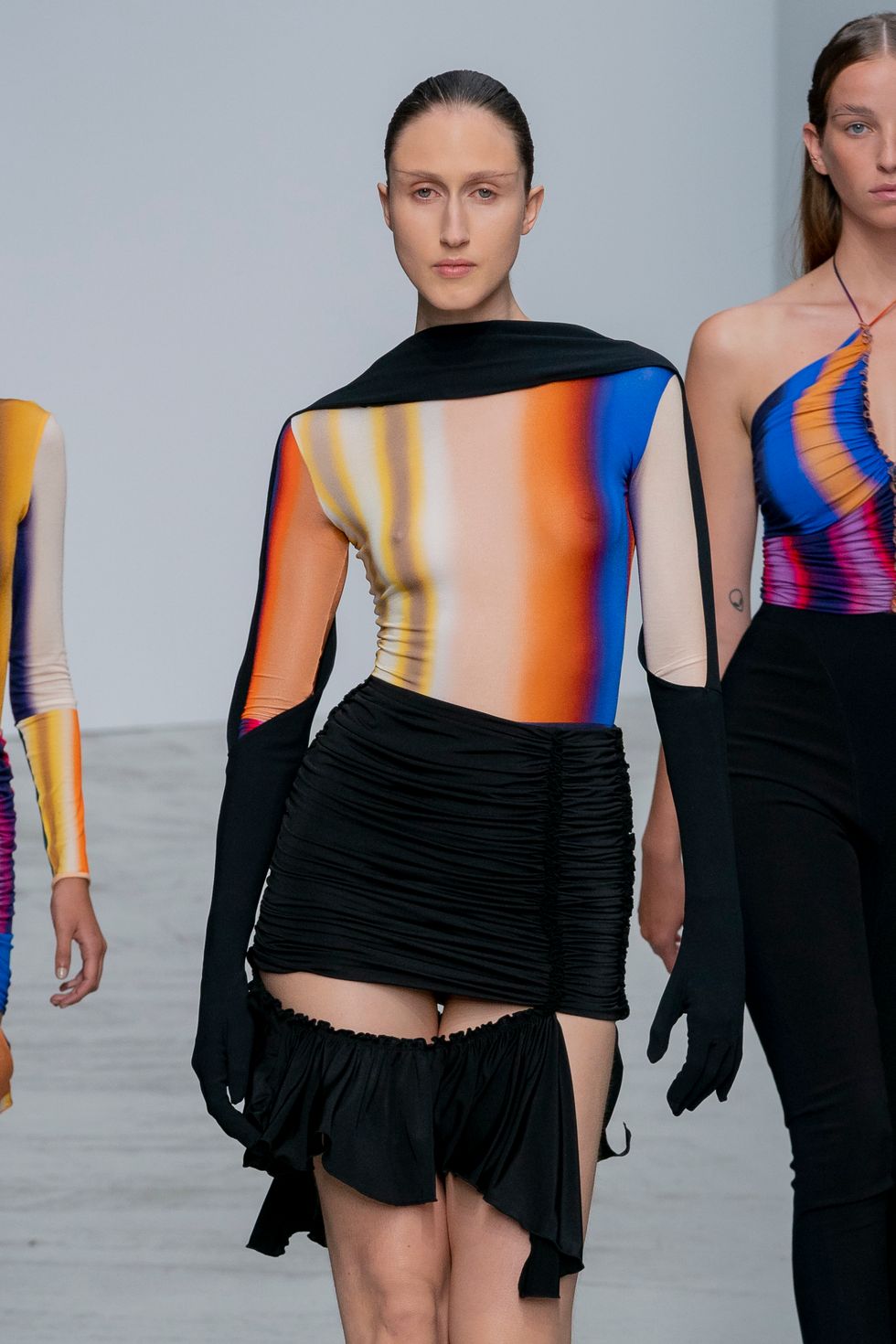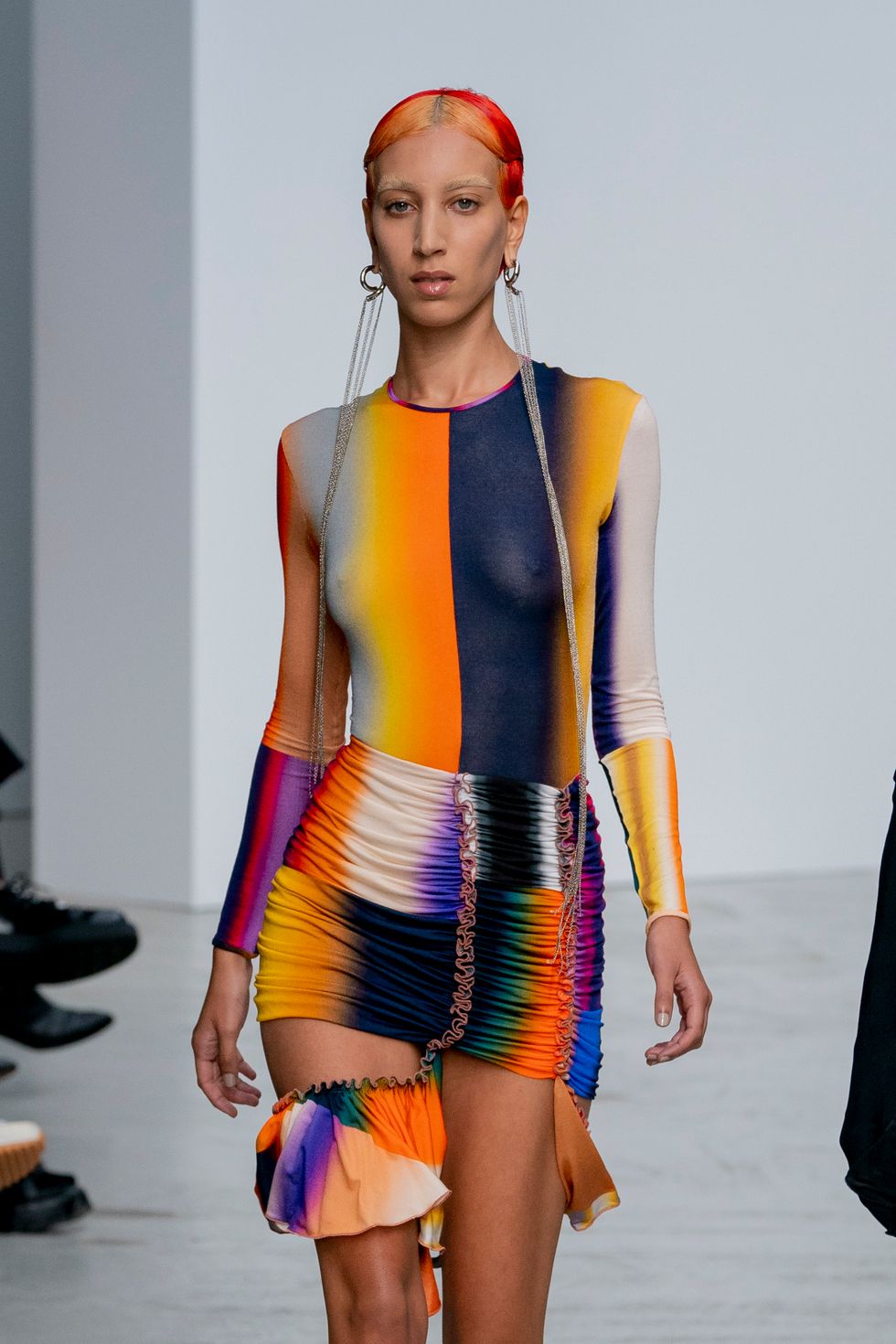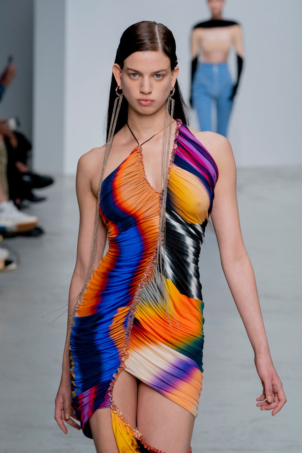 Multi-colored stripes in hazy, gradient hues were printed on fitted dresses with cutouts and slash detailing.