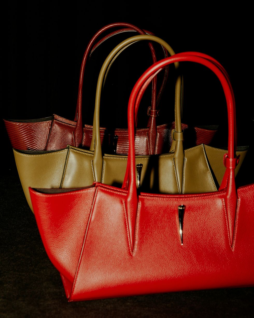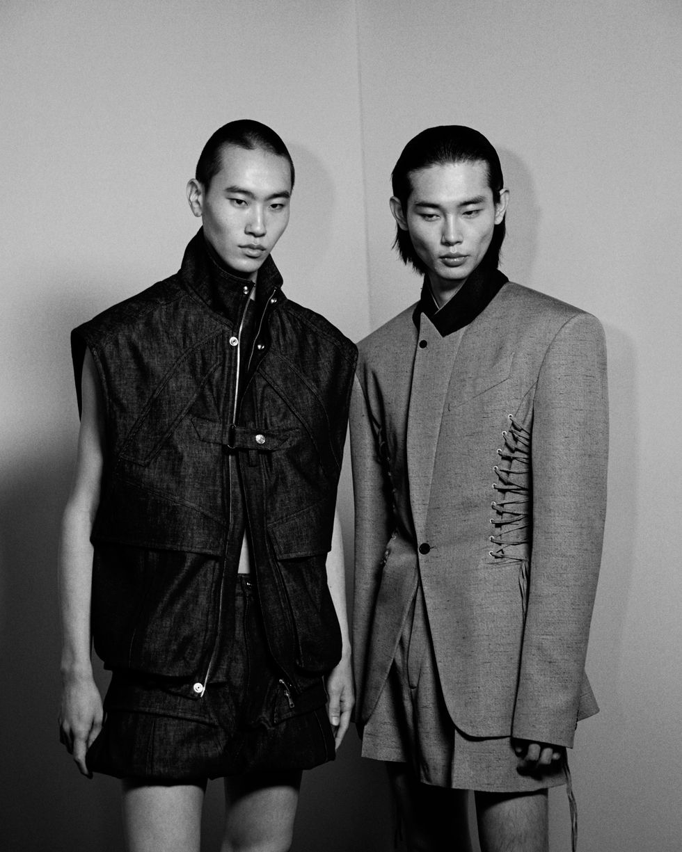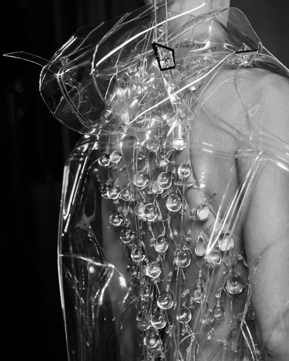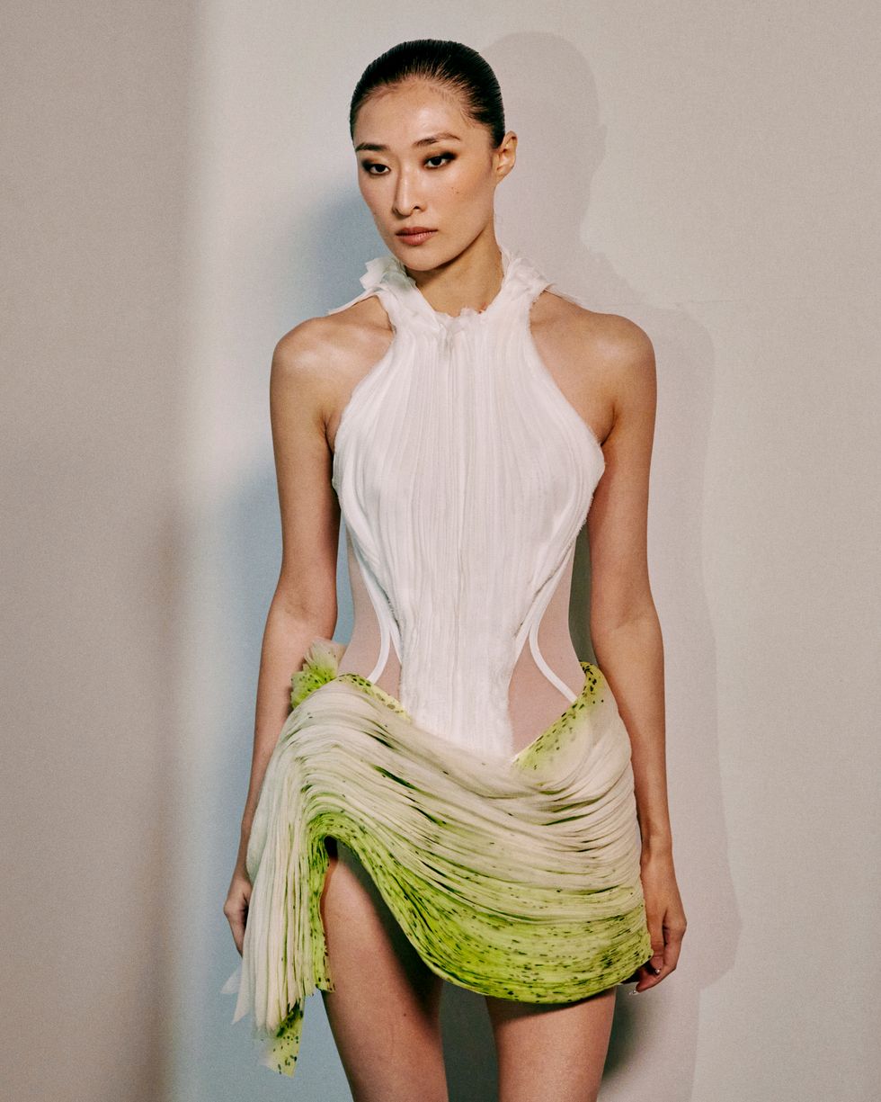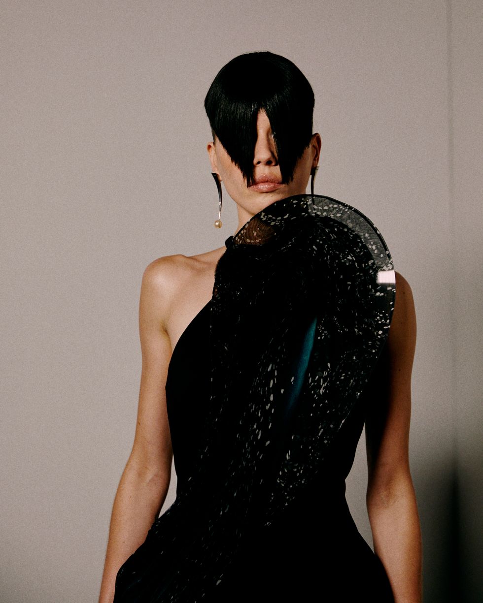 Colin Jones opened the show in V-shaped black bangs, complementing the sharp tailoring with a curved neckline, fastened by a single pearl button. What followed was dresses in stacked layers of dyed organza, utilitarian khaki sets, black dresses with petal-shaped skirts, and a conceptual dress embellished with Baccarat crystal drops suspended on clear netting and topped with a transparent PVC rain jacket.
