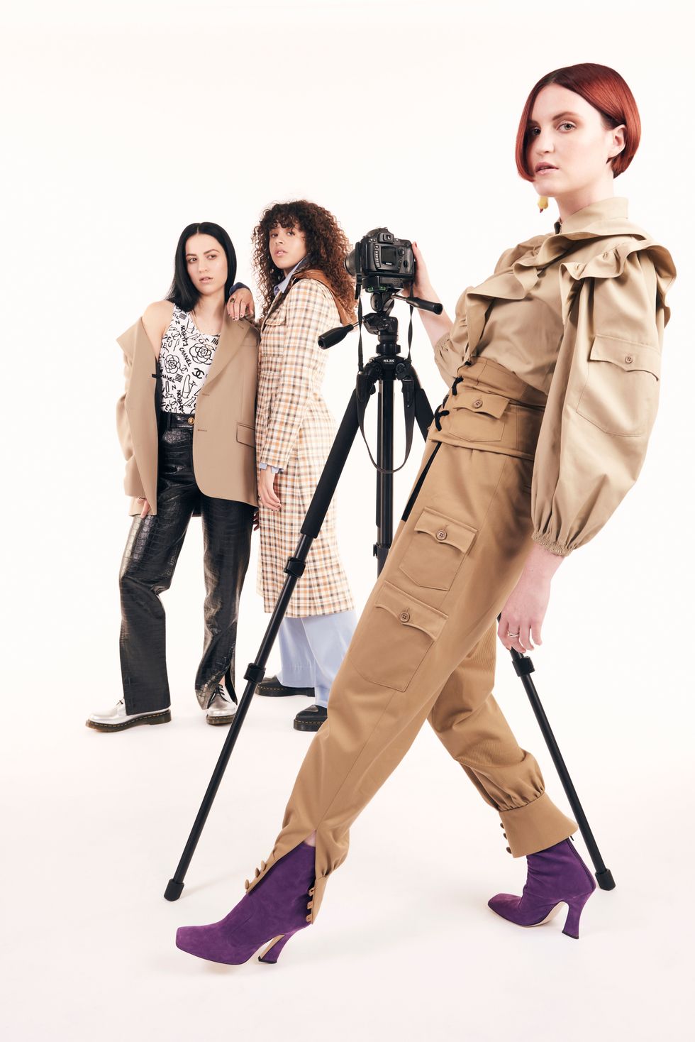 (On Naomi) Top & Pants: Moon Choi, Jacket: Bally, Rings: David Yurman, Shoes: Dr. Martens (On Katie) Shirt, Pants & Belt: Miu Miu, Earring: Missoni, Rings: David Yurman & Tiffany, Boots: Fendi (On Jo) Jacket: AMI, Rings: Bulgari, Shoes: Dr. Martens