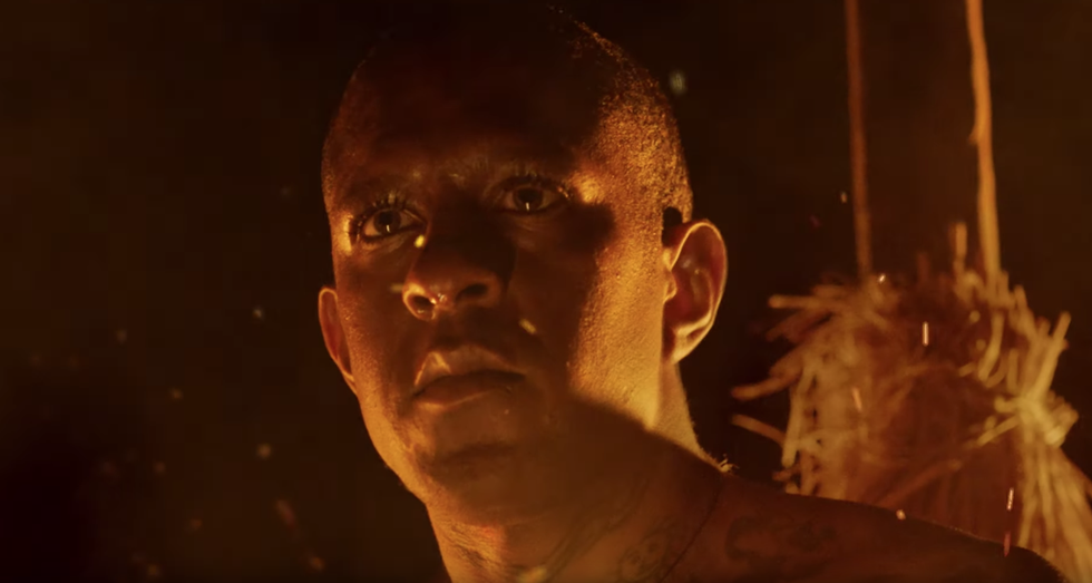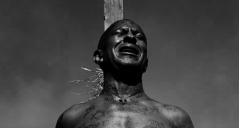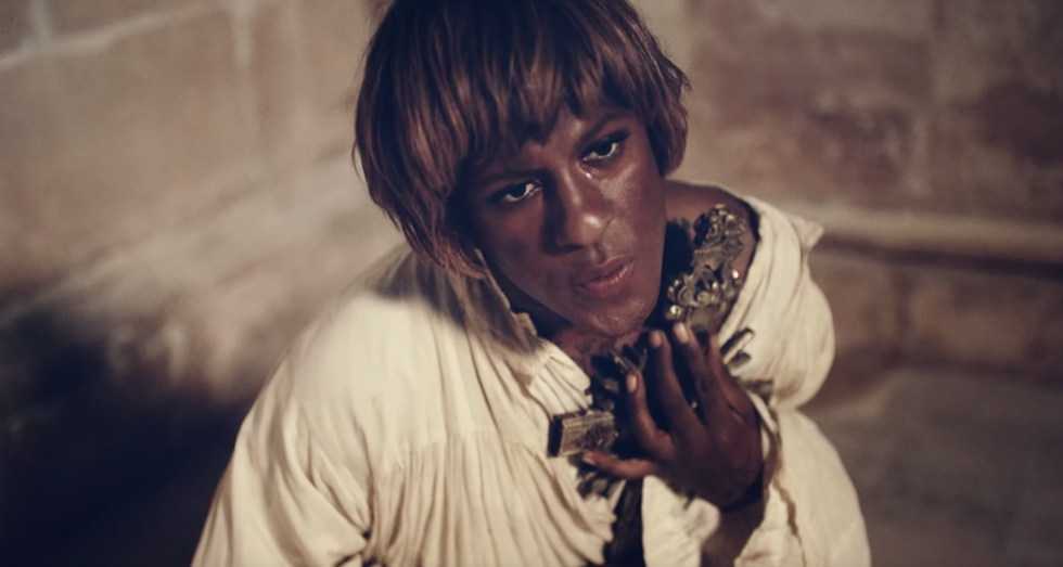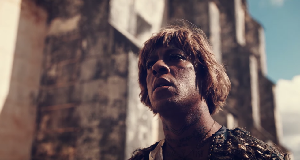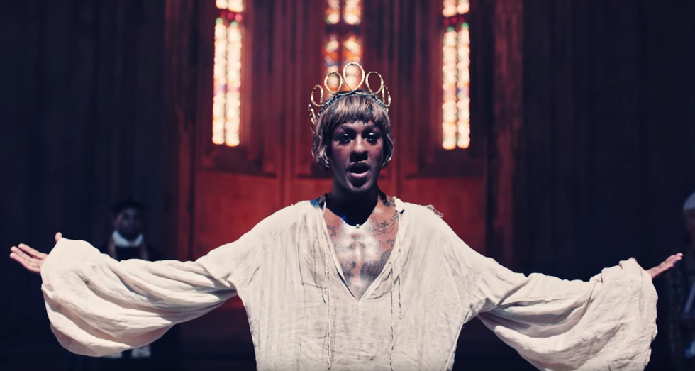 Embodying a gender nonconforming subject like Joan is something Mykki carefully considered, as someone who now identifies with he/him pronouns. But the rapper doesn't completely identify as cis, either: "I'm not a drag queen," Mykki says, addressing how men in women's clothing are often quickly labeled as such — especially considering the mainstream phenomenon of Drag Race. "While my narrative is true that when Mykki Blanco began, I was going to transition and didn't, I feel this idea that I'm a cis gay male really does make me uncomfortable and it makes me feel incorrect. At the same time, I feel like I shouldn't have to perform my gender to make myself seem more gender nonconforming just to appease someone's belief about me." Swinging between femininity and masculinity throughout "Dark Ballet," Mykki's take on Joan of Arc mirrors how his own everyday relishes the in-between.