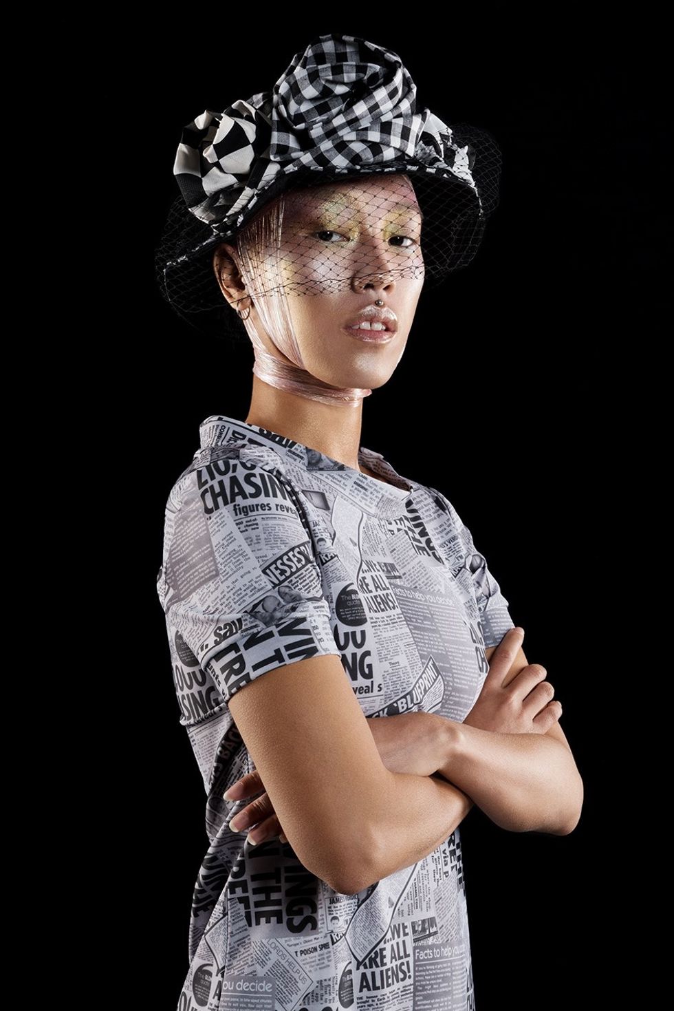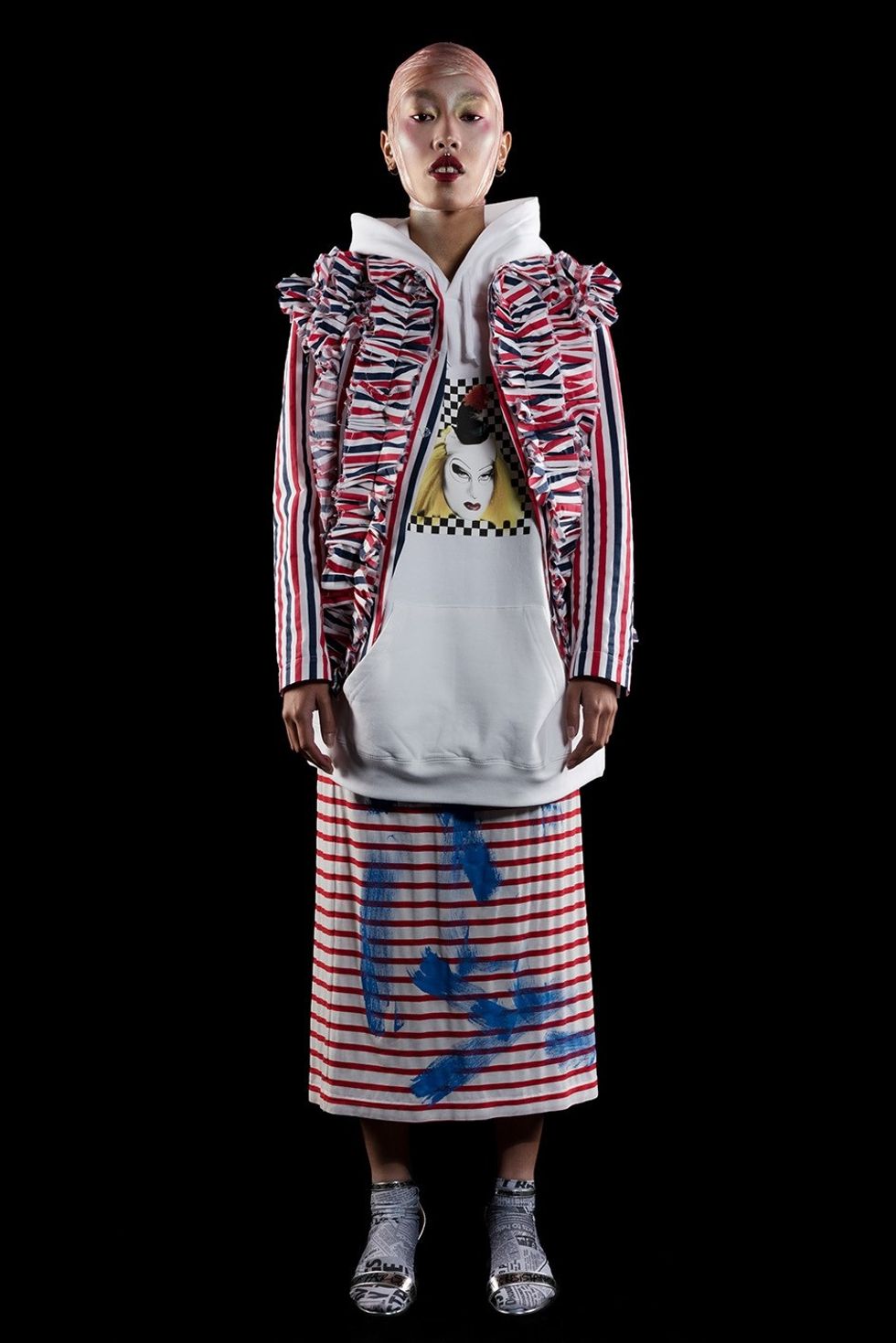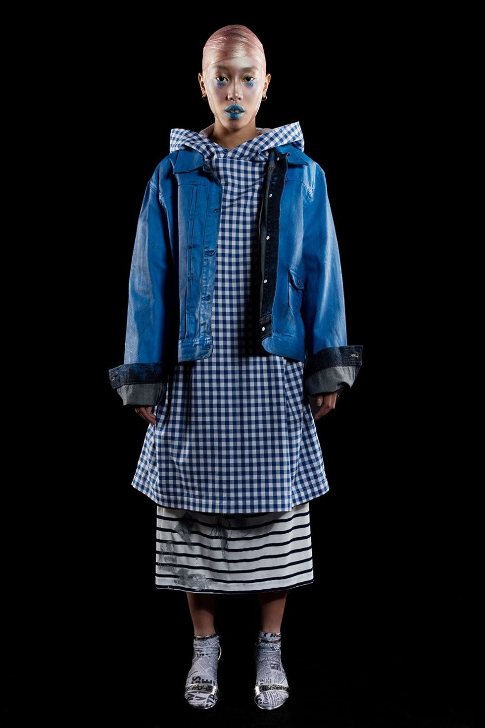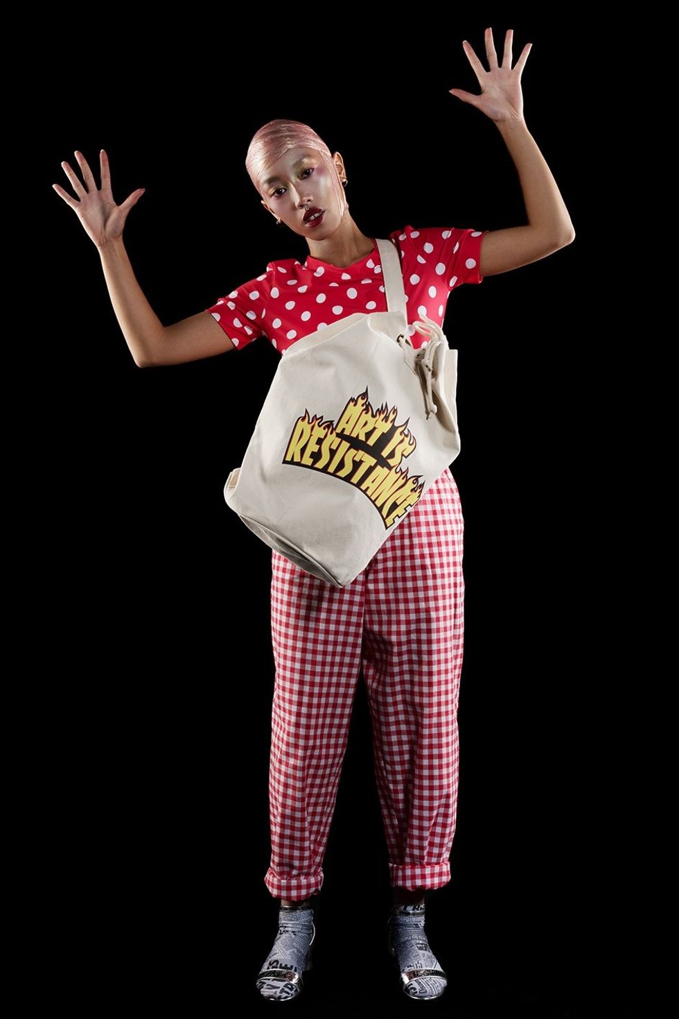 His designs have achieved big-in-Japan cult status among ultramodern fashion lovers everywhere. (The ubiquitous "Karl Who?" bag that even Karl Lagerfeld has worn during various fashion weeks, is one example of their iconoclastic power). That said, Naco's latest collection — a revival of his "Art Is Resistance" themed line which first debuted in 2014 with recycled pieces and hand-painted slogans — prominently features rebellious takes on classic prints, ranging from polka dot and gingham to checkerboard and newsprint.