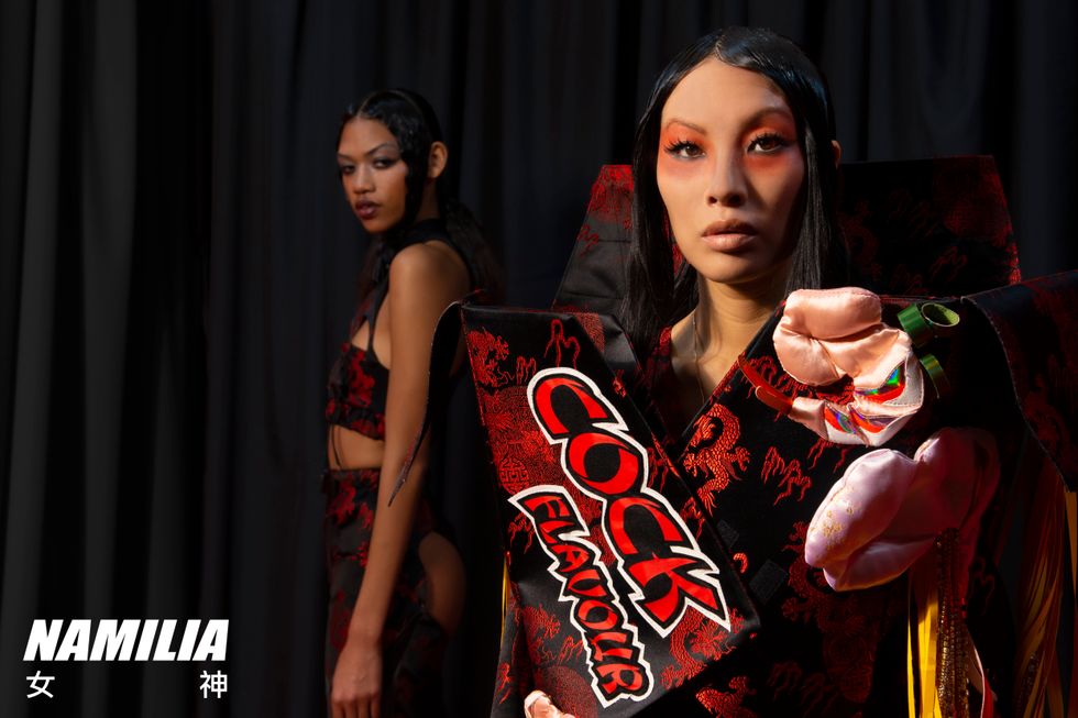 Back in February, a cast of all-asian adult film stars walked the Fall 2020 runway for Namilia, the sex-positive fashion label helmed by Berlin-based duo Nan Li and Emilia Pfohl. Among them was Asa Akira, who was dressed in a black bodysuit and robe with "COCK WRECKER" printed on the sleeves.
