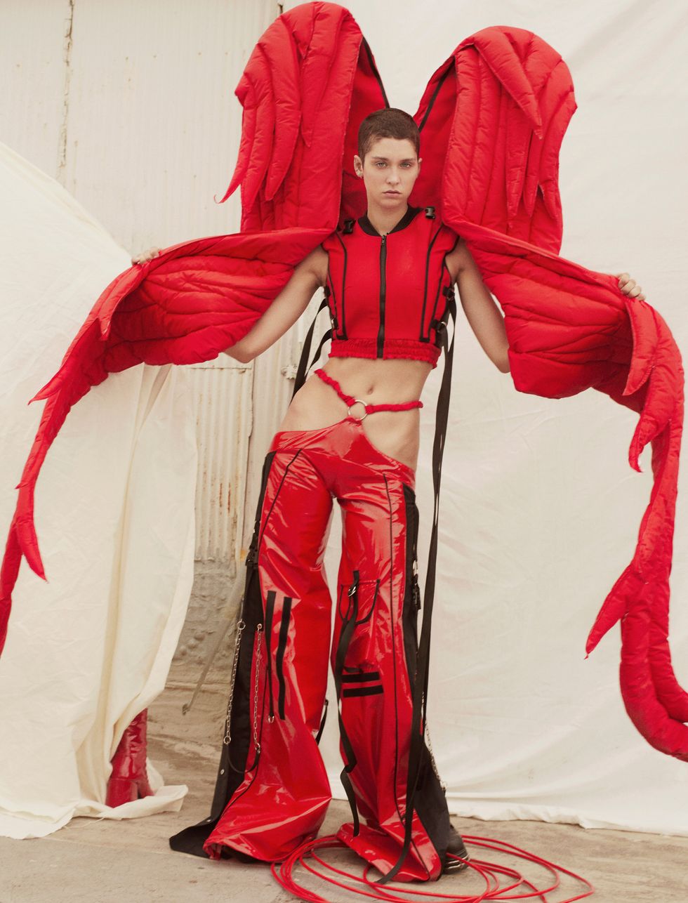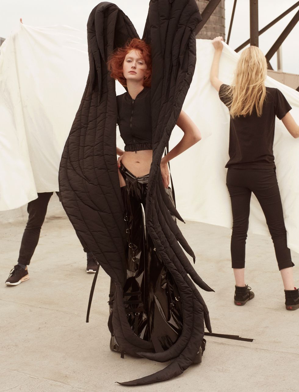 We wanted to translate these very historical, medieval wing references in a new hyper-modern way, so they were all made as part of puffer vests or tactical trousers in technical nylons, clashing the decorative with the functional.