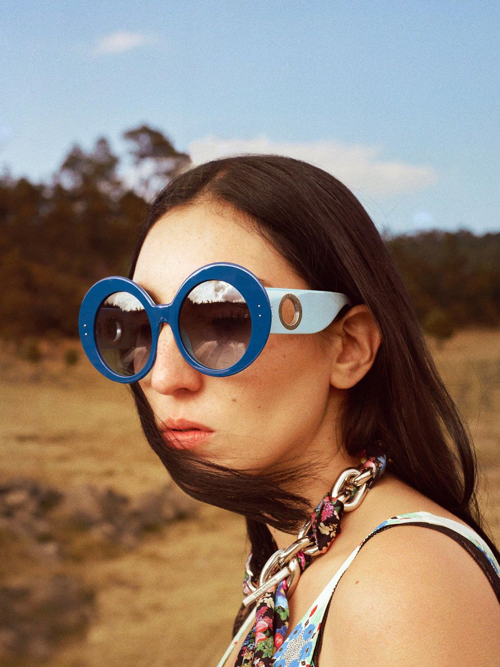 Paco Rabanne and Linda Farrow unite for an eyewear collection. The collection's debut features two silhouettes, Donyale and Moe. Donyale offers a curvaceous silhouette complimented by blue tonal colors. Moe is a unisex frame with its strong lines and edges juxtaposed by a soft powder pink color. The collection is brought to life in a Thelma & Louise-inspired campaign by Quentin Saunier. Available now at PacoRabanne.com.