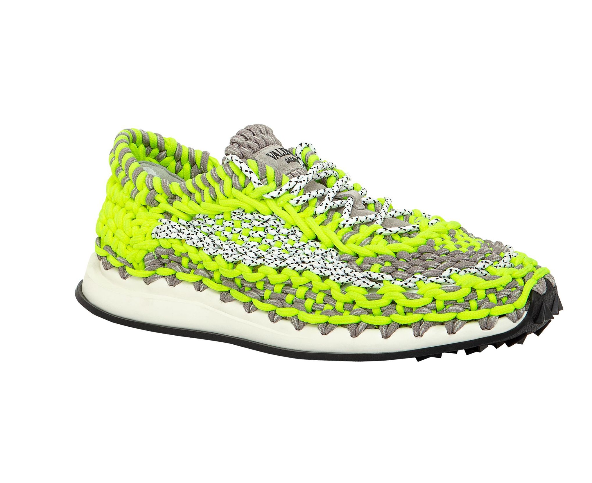First introduced in the SS21 men's fashion show and conceived by Pierpaolo Piccioli, these Valentino Garavani crochet sneakers feel very expressive: its body features their famous macramè, a material traditionally used for couture gowns that for the first time is now seen in accessories — the woven upper is draped in tubular fabric laces, and the sole is the VLogo signature. The dynamic design intensified by the graphic colorway is unlike any other sneaker of the season, and deserves to be worn for an adventurous outing. Available now in Valentino stores.