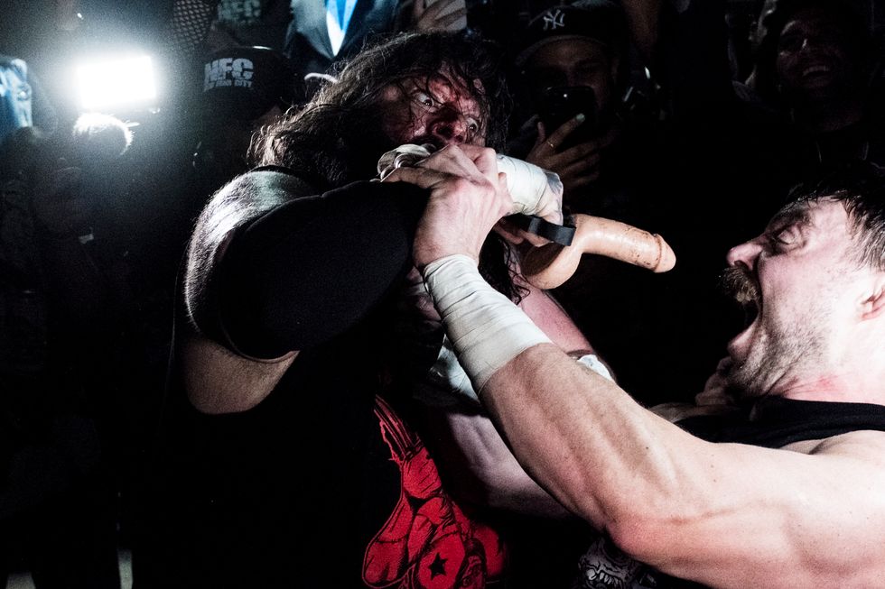 New Fear City, an indie wrestling promotion hosting full-throttle, no-ring “deathmatches,” has amassed a cult following true to their “come one, come all” attitude. On the Sunday after Valentine’s Day, a line formed around the block at a Brooklyn warehouse for their sold-out “Valentine’s Day Massacre,” an evening of blood, barbed wire, spiked dildos and cupcakes.
