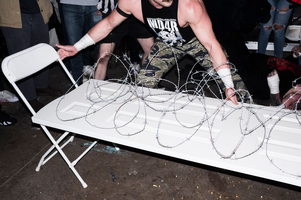 When I sat down with New Fear City (NFC) founder and deathmatch wrestler Casanova Valentine, who fought in Sunday’s final match, he paused to pull a gold thumbtack out of his knee. His friend, nightlife promoter and photographer Nick Karp, joked “no glass today.”