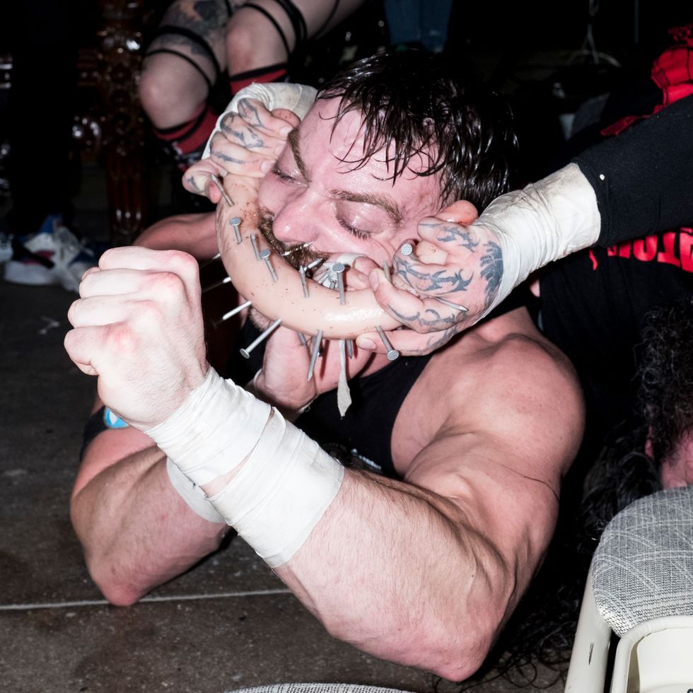 Deathmatches occupy a niche within the wrestling world. While they maintain many of the performative elements typical of the sport, including storylines between characters that span matches, they notably incorporate weapons. For the Valentine’s Day Massacre, these included full-sized doors, chairs, a red rose and a heart-shaped chocolate box full of thumbtacks, spilled across the floor before two brawlers took turns slamming each other into the ground. Add in the “no-ring” element and you find yourself on the fringe of the genre; a place that pushes the physical and mental limits of its performers and creates a unique, wholly electric relationship to the crowd.