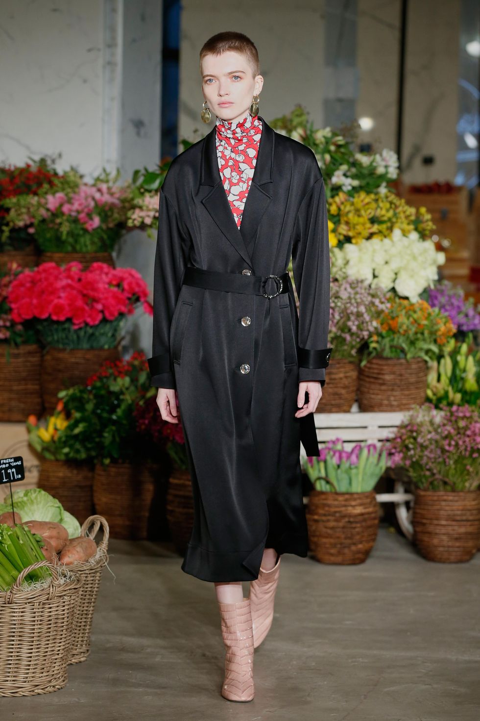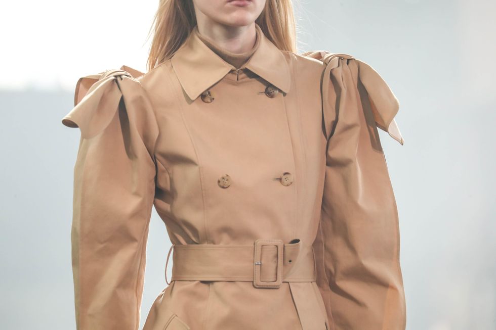 If there's one look that captured the essence of Gabriela Hearst the best, it was this simple camel trench coat with full sleeves and intricate knots on the shoulder. With even more eyes on the designer than before (her debut at Chloé is set to take place next month), this collection encapsulated her vision of taking American classics and imbuing them with craft and artisanal elements as seen in the engineered Swiss lace and leather macramé elsewhere.