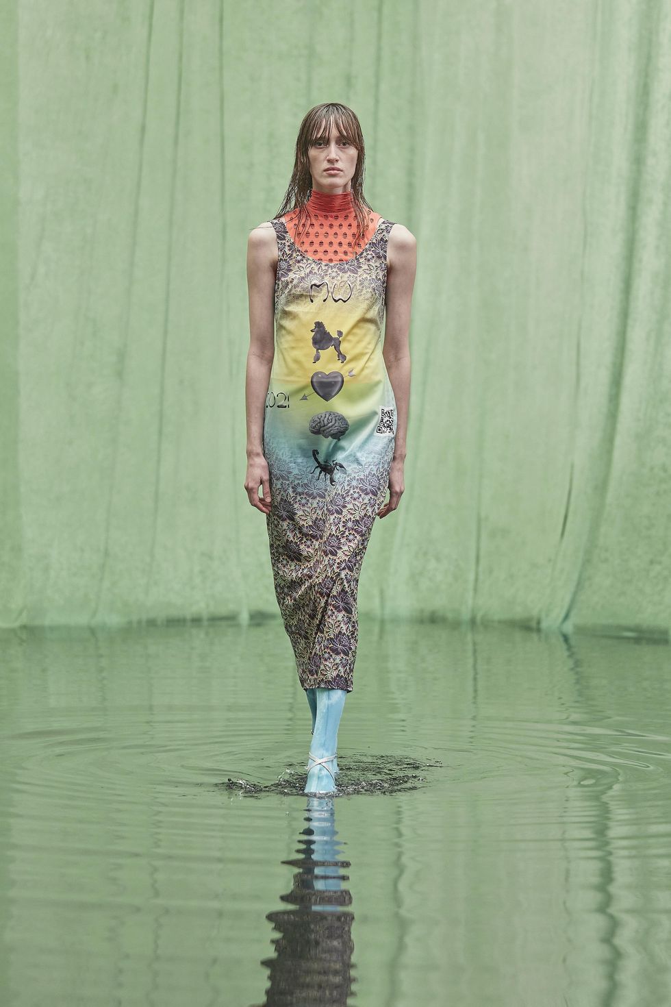 LA-based brand Maisie Wilen was the first recipient of Kanye West's incubator grant for emerging designers and has since been worn by the likes of Kylie and Kim (its founder Maisie Schloss is a former Yeezy womenswear designer). For her Fall 2021 collection, she had models in an enclosed green studio walk on a flooded set that reflected the many intricate prints and details of the clothes. The fashion-meets-tech approach also extended to the scannable QR codes that overlaid florals and chromatic swirls trimmed with delicate lace.