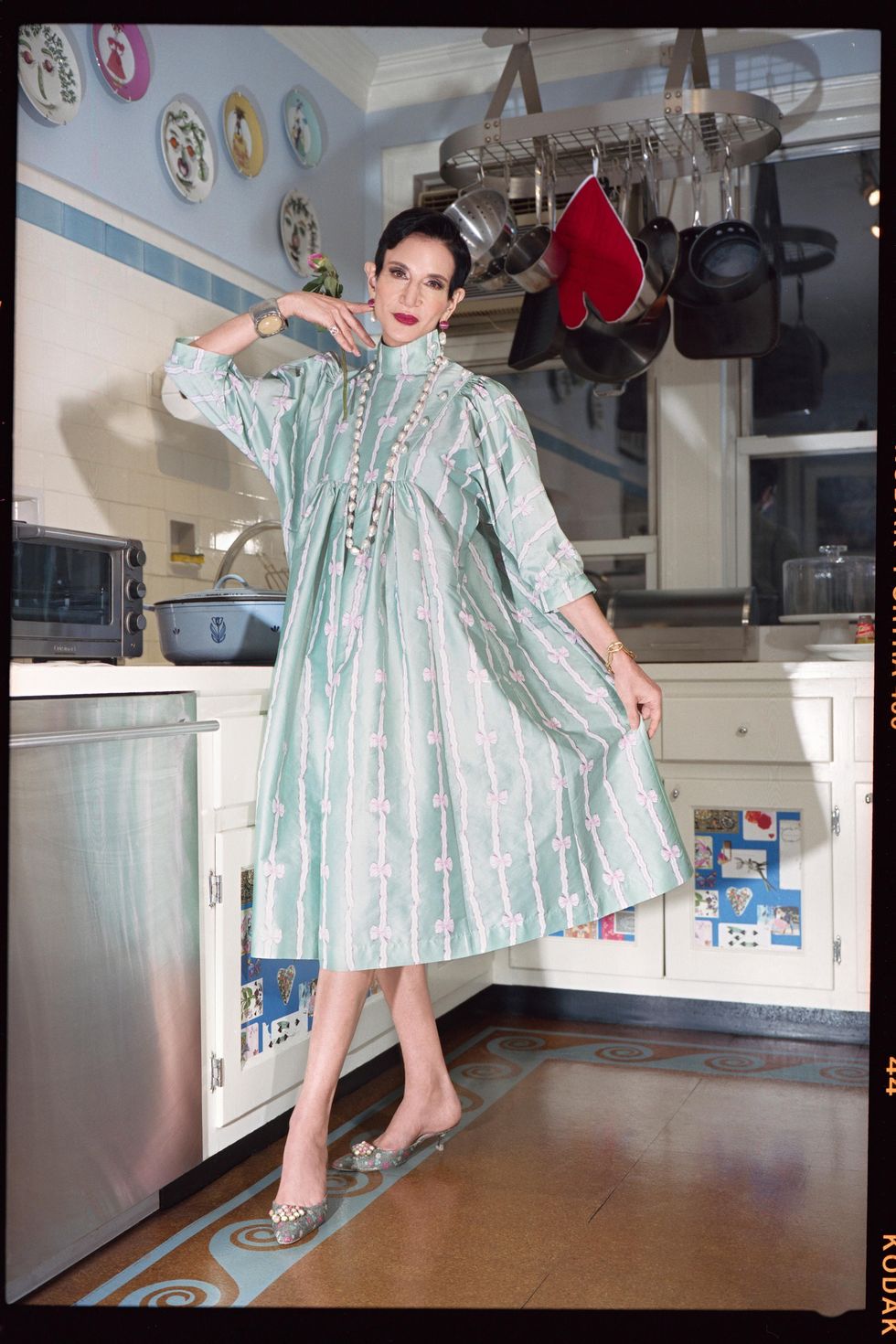 One of the standout show formats of last season was Batsheva Hay's lookbook-cookbook hybrid that showed women at home in their kitchens wearing the designer's glorious nap dresses. For Fall 2021, Hay continued to explore that concept where she had women like Amy Fine Collins and Nicky Hilton Rothschild pick out what they want to cook and wear. "The intimacy of cooking and being at home is a backdrop for them to wear outfits that are nostalgic, comfortable and whimsical," Hay said. "The kitchen is the best studio because it is so disarming and all the women were so comfortable in their own spaces."