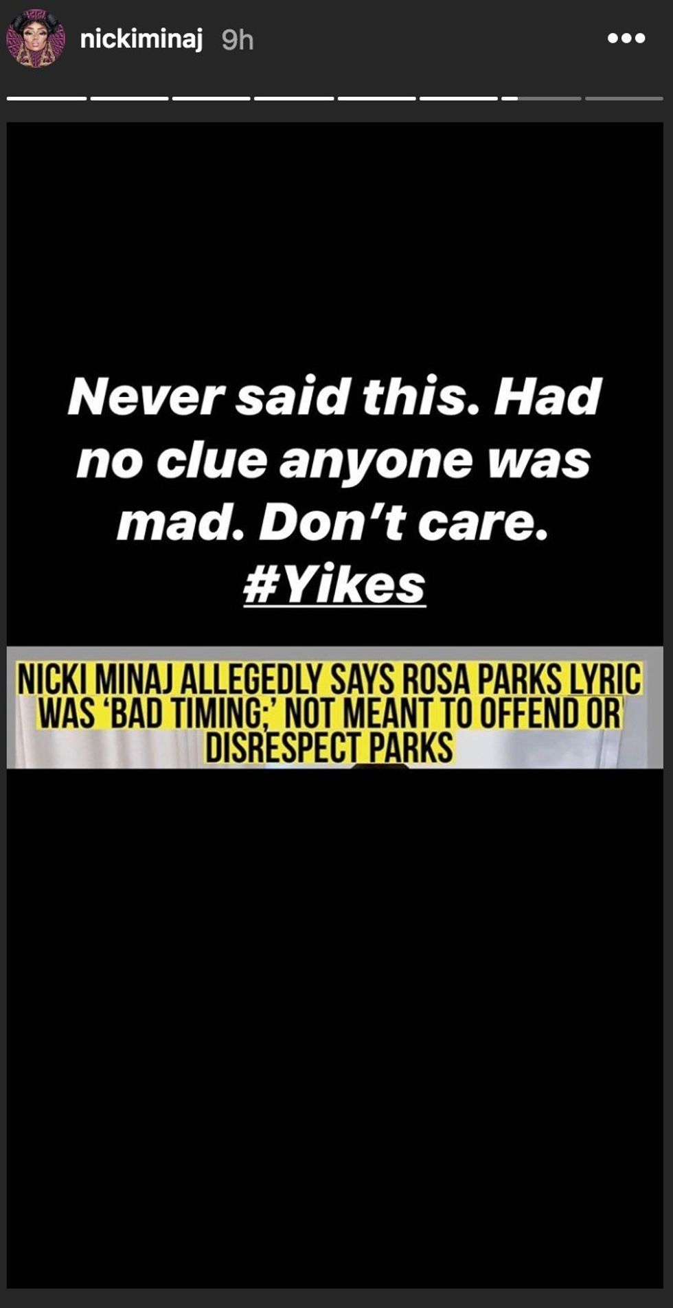 "Never said this," Minaj wrote alongside the picture, before adding, "Had no clue anyone was mad. Don't care. #Yikes."