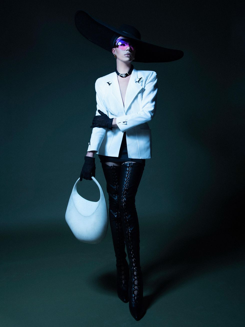 Hat: Alessandra Rivera, Jacket and bag: Thierry Mugler, Skirt: Mia Vesper, Boots: Akira