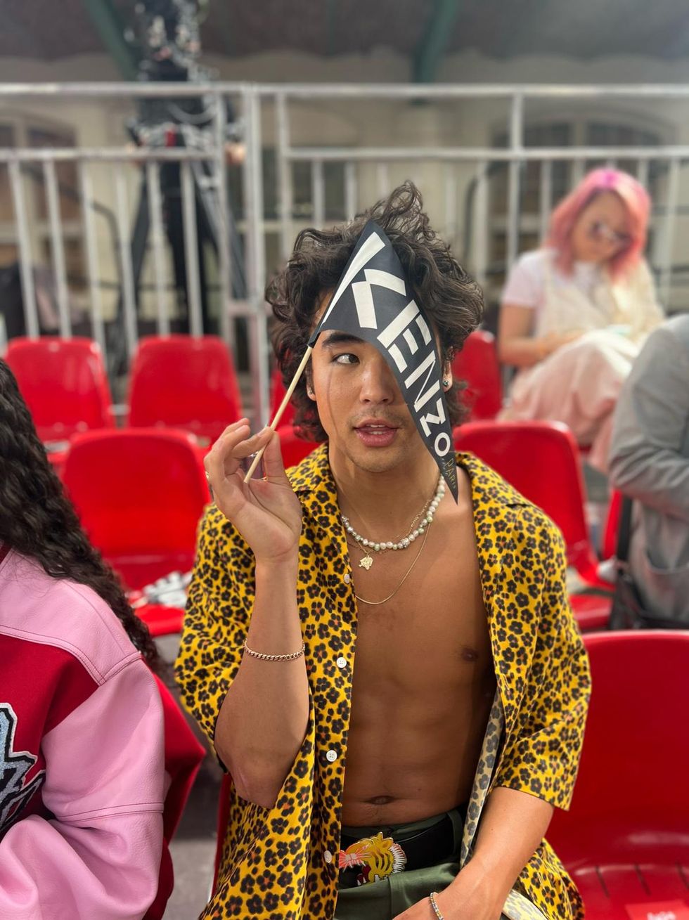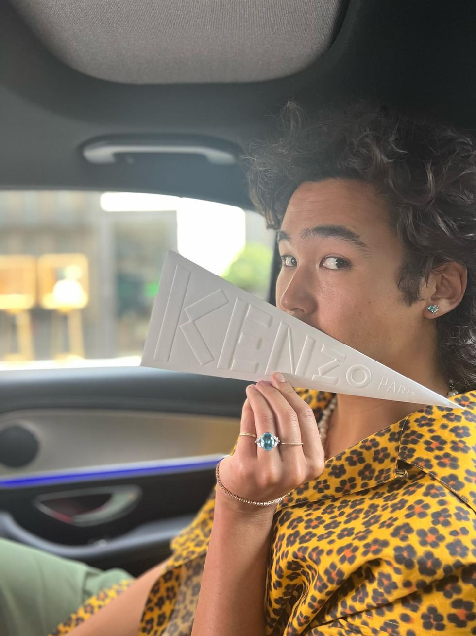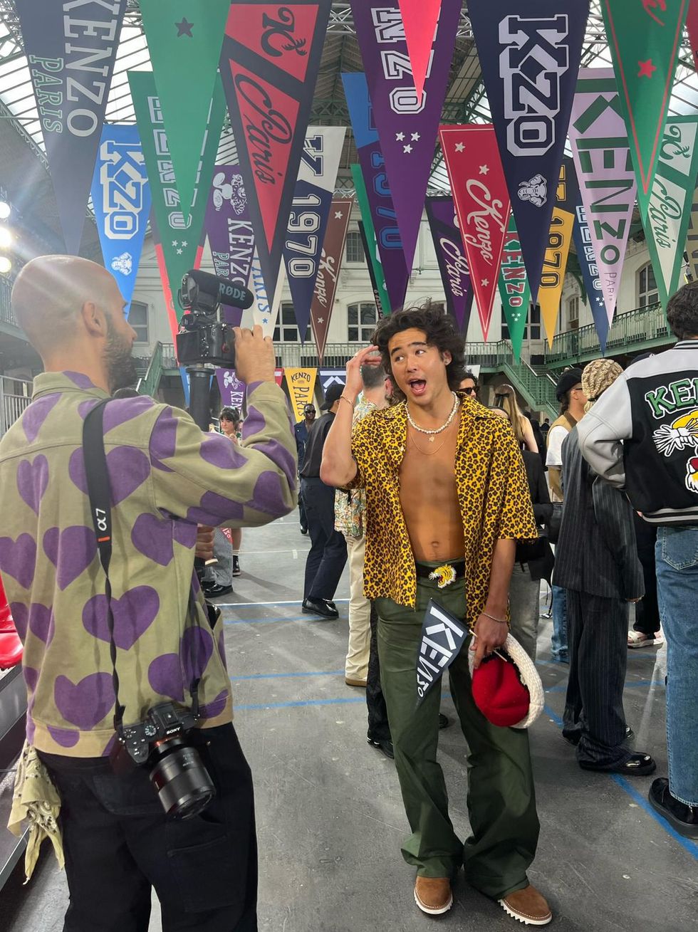 Hiraga and Kenzo both share Japanese heritage — the 24-year-old is half-Japanese, and Kenzo, which was founded by its late namesake Japanese designer Kenzo Takada, is currently designed by Japanese creative director Nigo. For the big day, he was dressed in a yellow Kenzo floral shirt and army green pants with a tiger belt, and he took photos with fellow showgoers Omar Apollo and Jaden Smith.