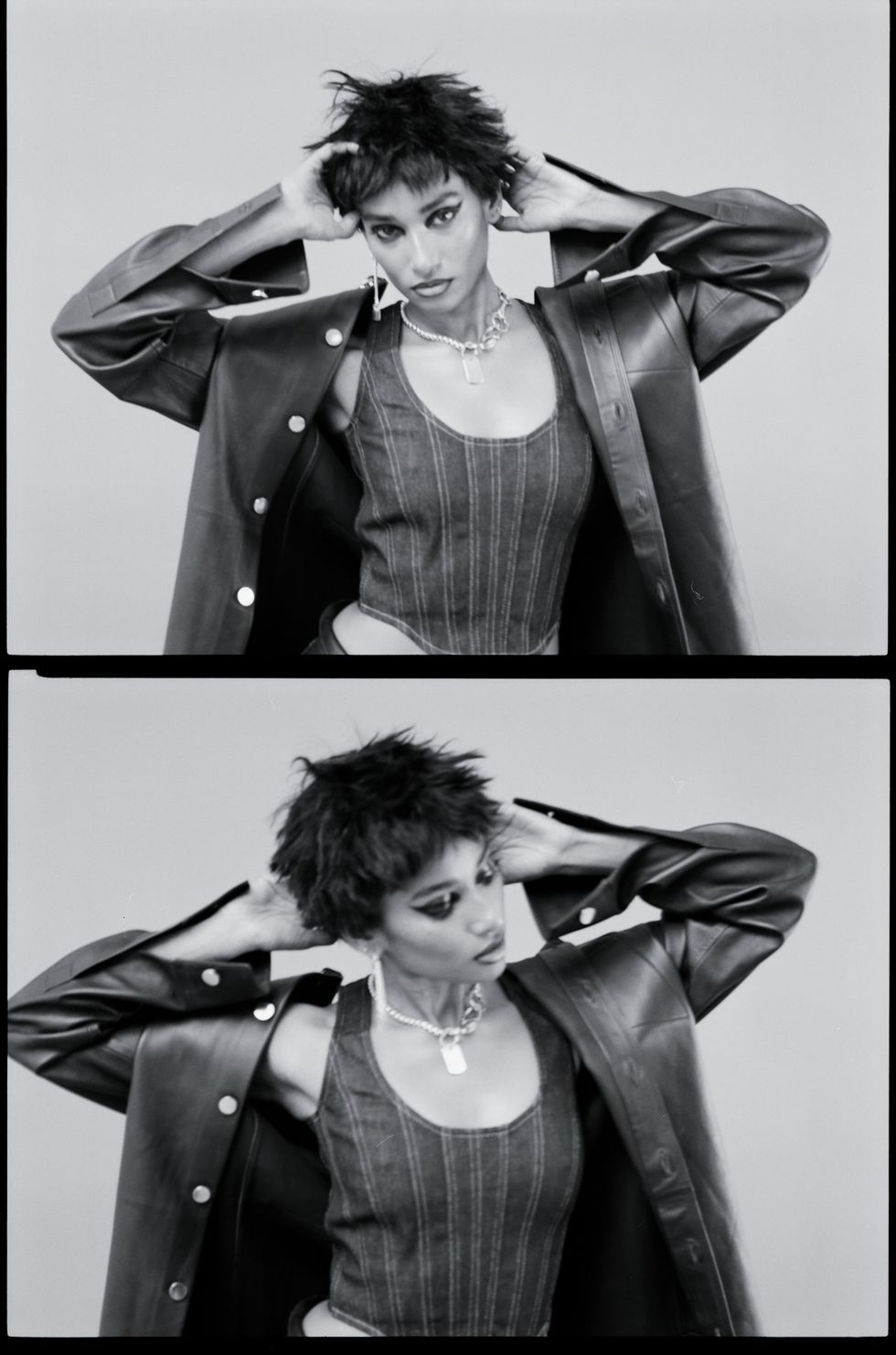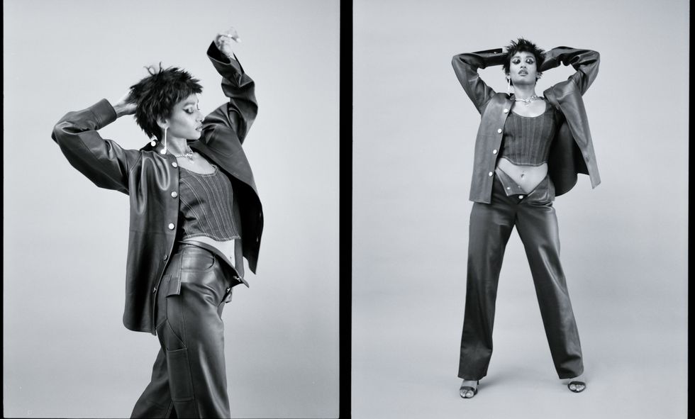 Shirt and pants: Bottega Veneta, Corset: Eckhaus Latta, Shoes: Pierre Hardy, Jewelry: Martine Ali