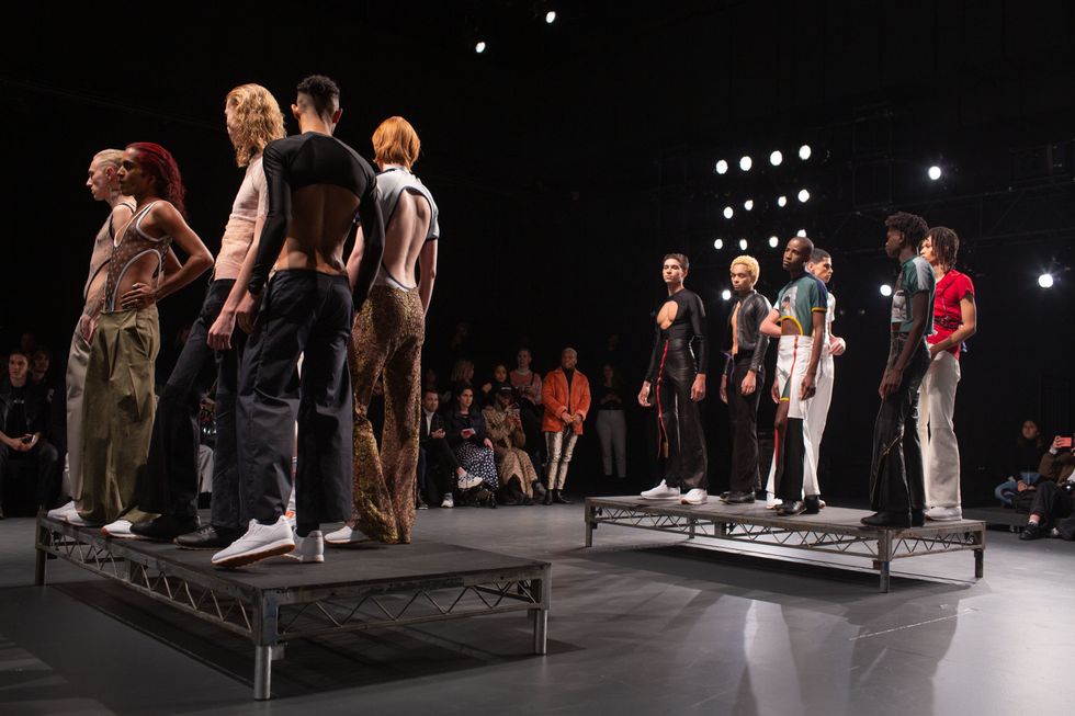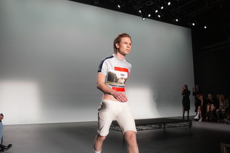 Nihl's fall 2019 collection was full of revealing pieces. Leotards were low-cut to reveal hipbones and spandex tees had cut-outs to show male cleavage. "It's about subverting male stereotypes and I'm always trying to find the most interesting garment to splice," Grotzinger told us backstage after the show.