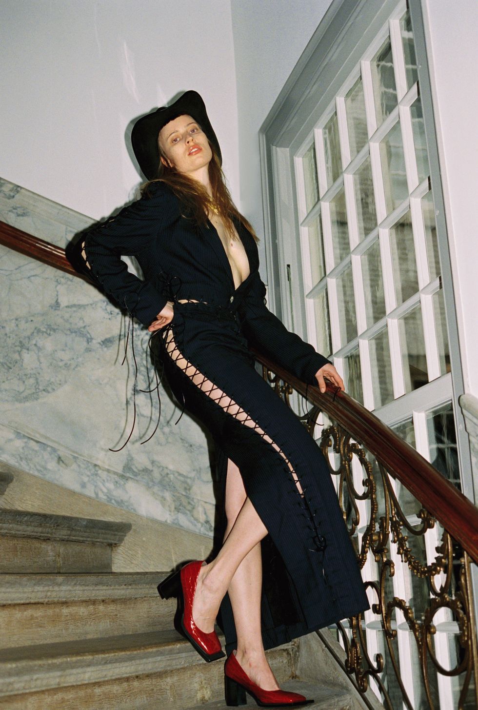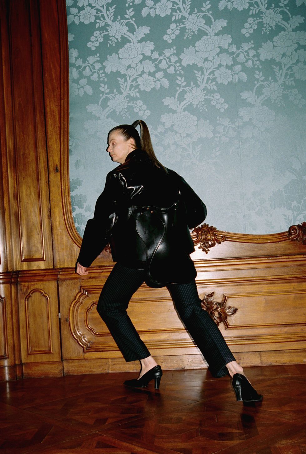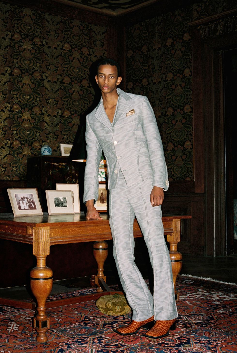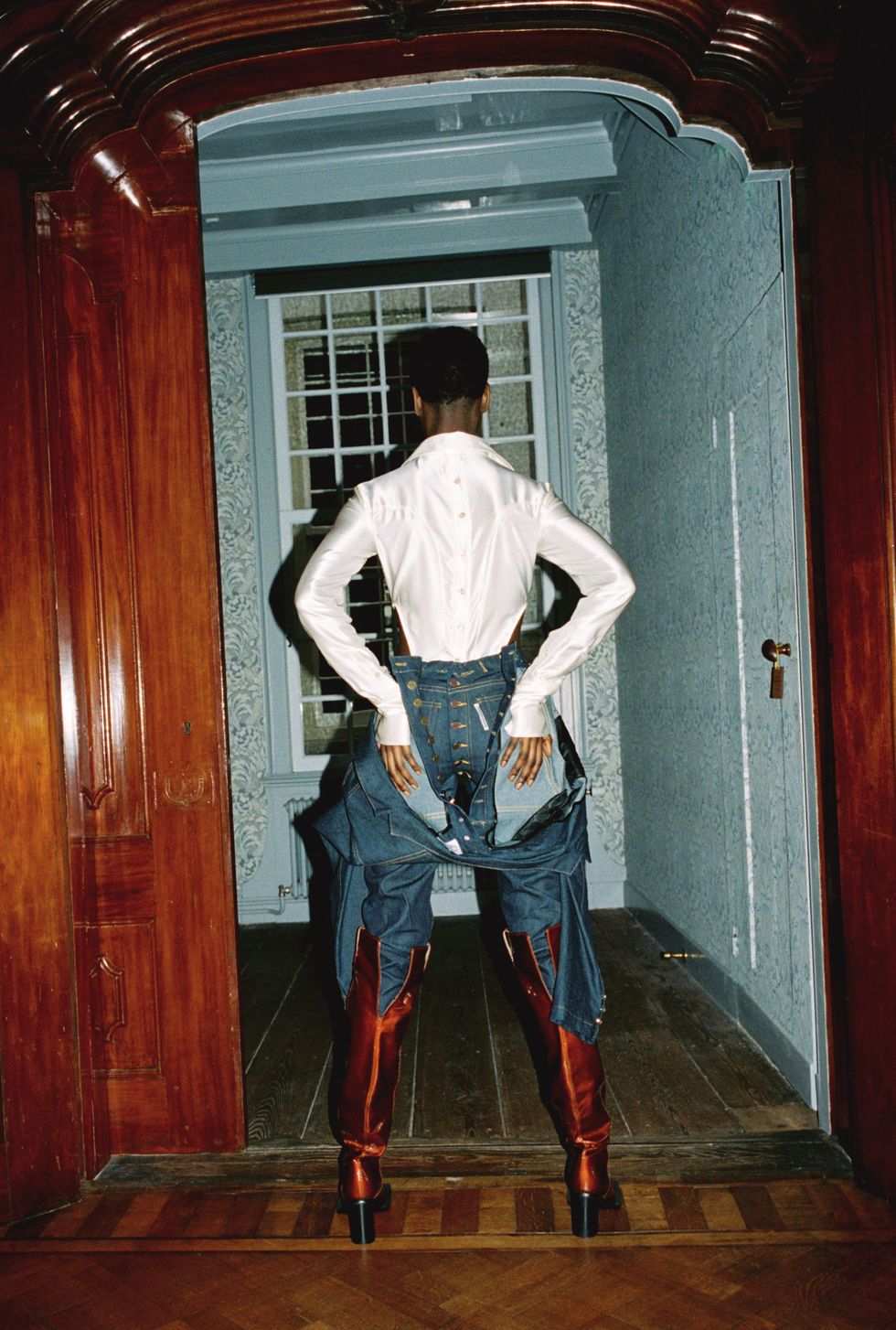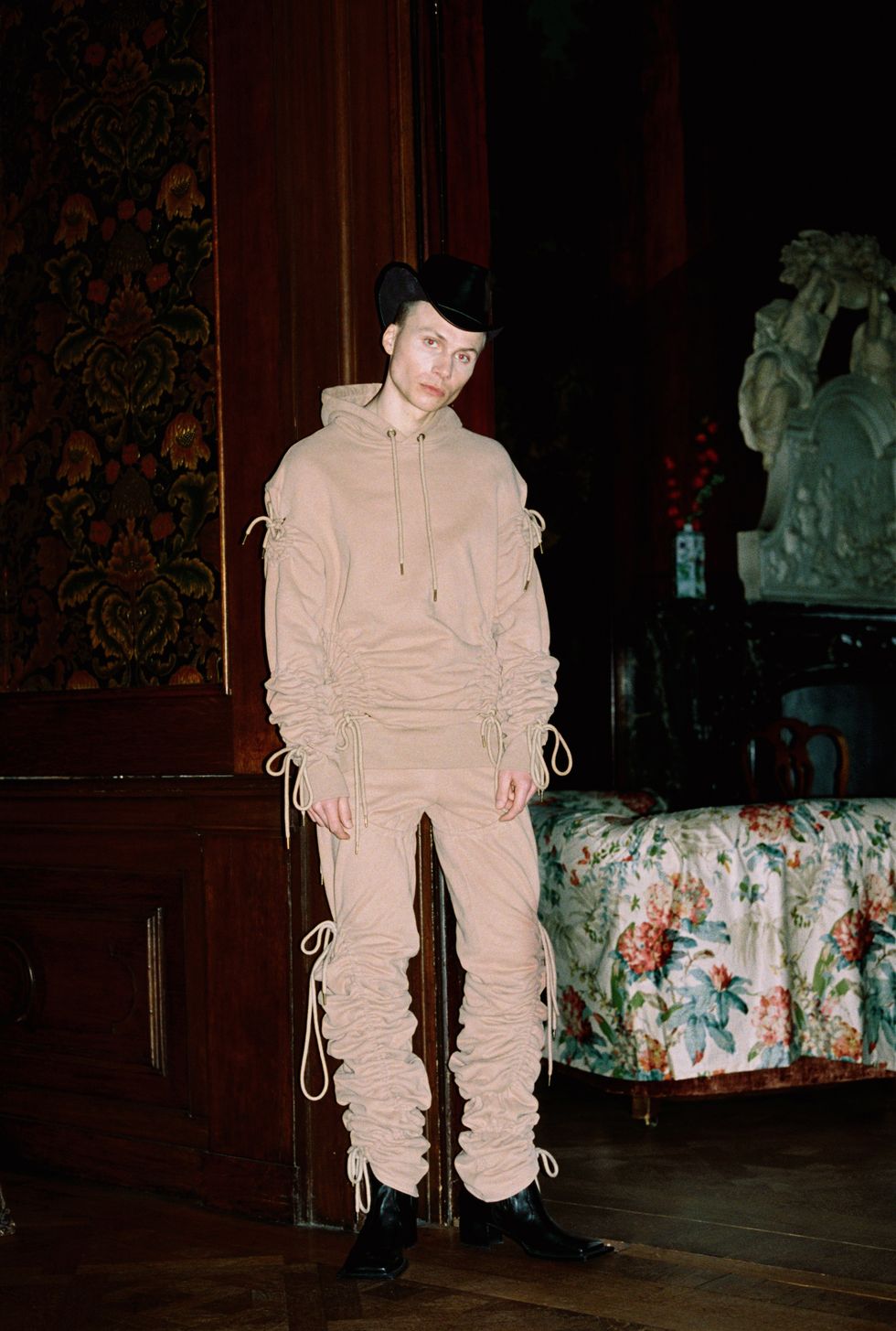 The collection, titled Evolve Around Me, had shown the weekend prior at Paris Fashion Week, but got a second life in Ninamounah's home city. Where PFW was structured as a runway show, featuring a fire sculpture and cameos from Fischerspooner's Casey Spooner and Richie Shazam, AFW reimagined the collection as a presentation inside a luxurious canal house, called Huis Barlotti. With its high, painted ceilings and old-world wooden walls, the environment provided an exciting juxtaposition to Ninamounah's erotic interpretation of "dominance and submission through the lens of evolution."