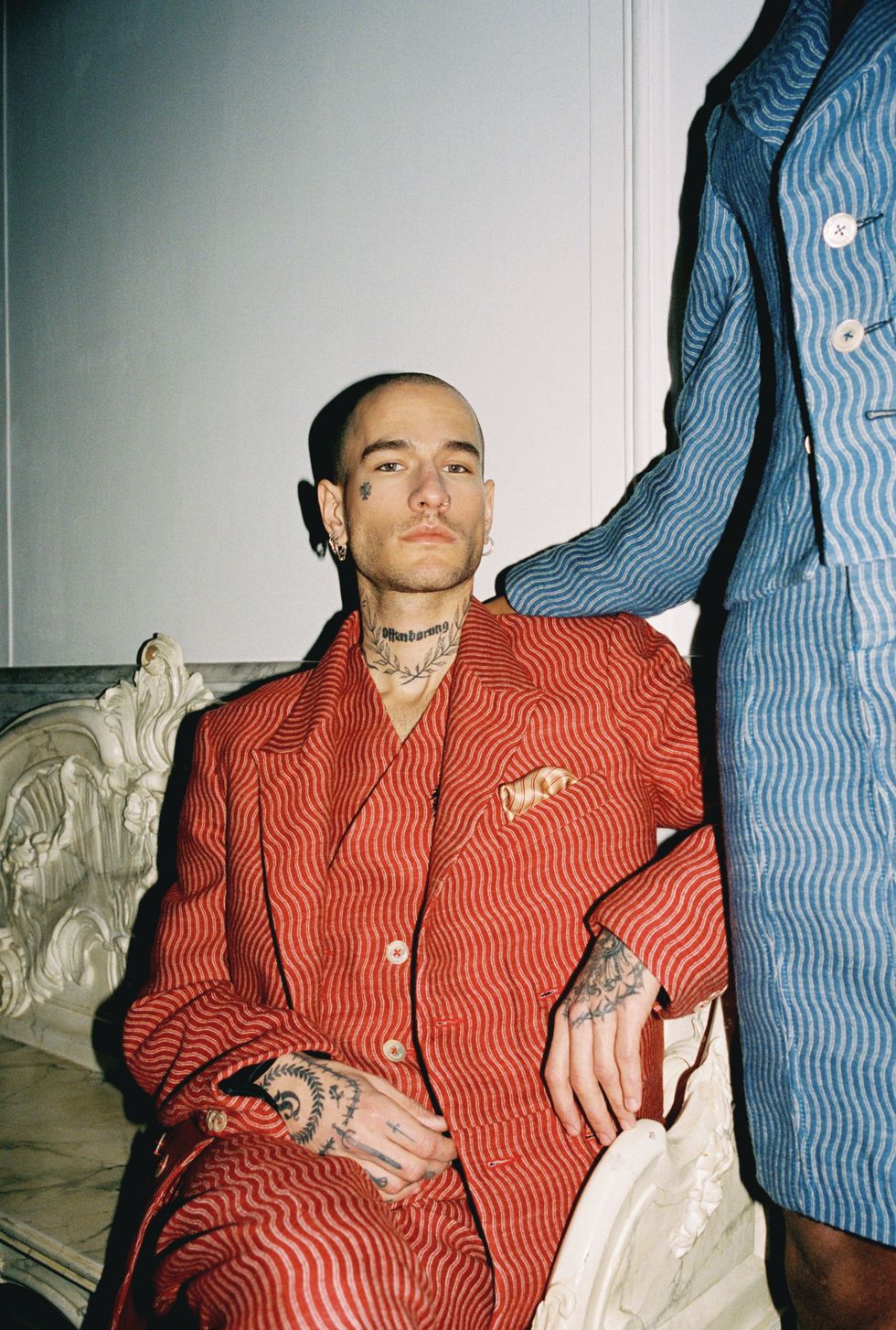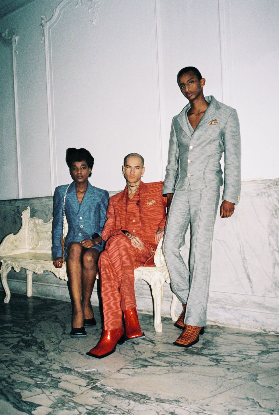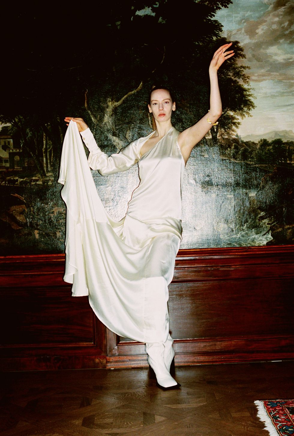 Extending her ideas of dominance, Ninamounah recruited longtime friend and local artist Sam Andrea to paint the collection live "in visual symphony." Models filed into the space to create a family portrait, only shifting their poses — stiff, stone-faced, and dramatic — when the string bass occasionally plucked a low, droning note. Andrea continued painting throughout, outlining cowboy hats and filling in his figures with bold hues like lime and red, or "the most aggressive color on the spectrum," as noted in Ninamounah's press release. "We wanted to work with still life because when you paint [this way], you want to show how rich you are," the designer said. "That's another human thing to do — to show how much you have." By the end, Andrea had created a portrait that could suitably hang inside Huis Barlotti.