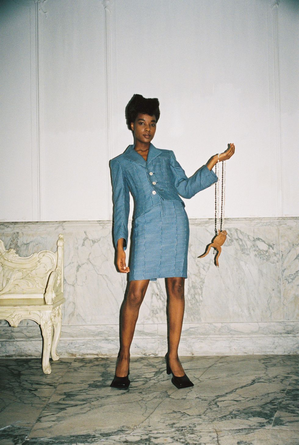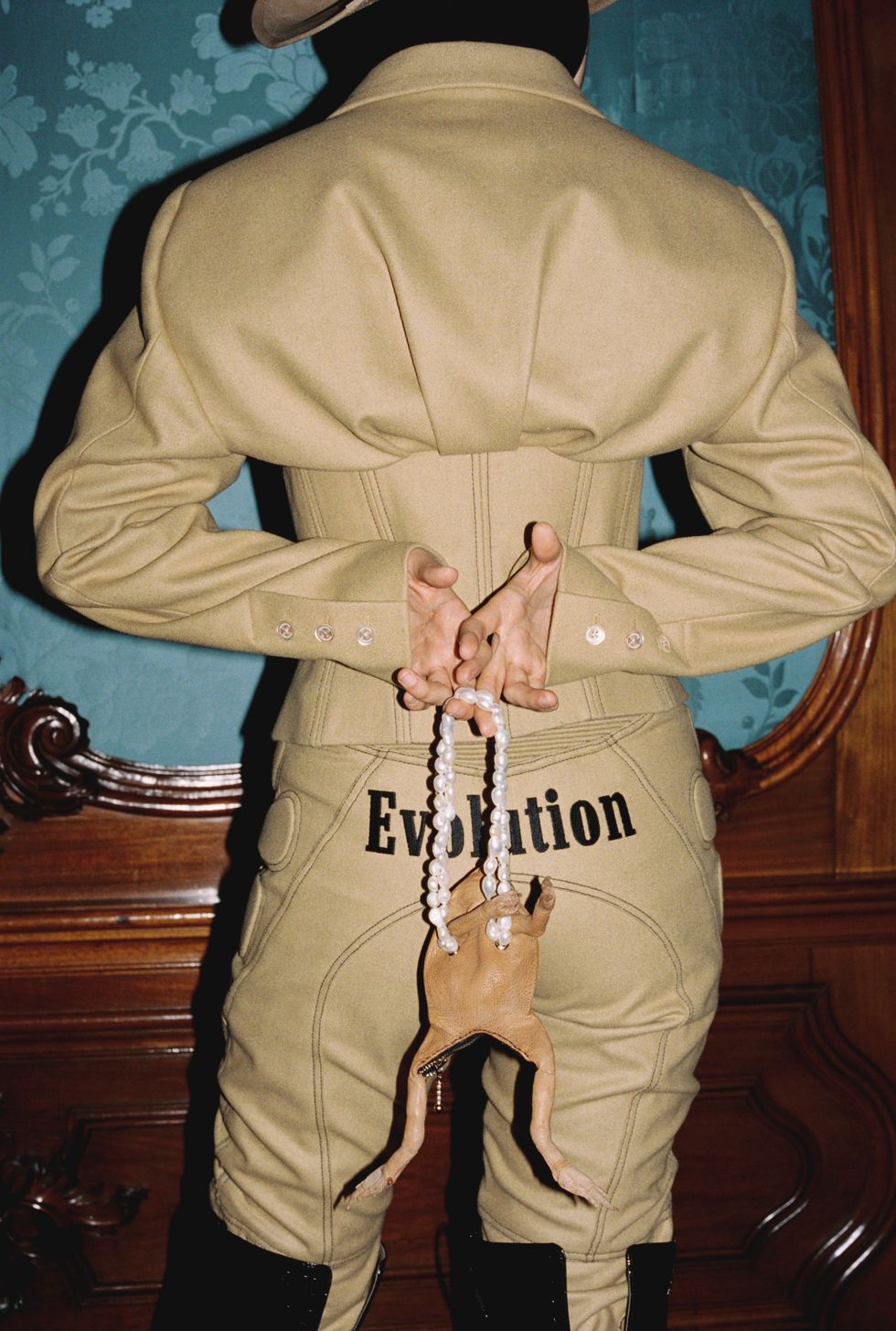 Beautifully tailored pieces grounded the collection, from boxy double-breasted jackets to looser pinstripe suits with lace-up detailing on the sleeves. This, like with all of Ninamounah's thinking, was intentional. It represented "restriction," she said. "[In society] you have to be tamed, and that's like taming a wild horse — taming, or suppressing, the beast that we are. We are still animals, and we shouldn't forget that." The majority of models wore cowboy hats, one of which was so enormous it made Jacquemus' #HatGate controversy look silly. There were playful frog-shaped purses, bodysuits styled with leather chaps, acid-washed denim, sensual corseting, and pieces printed with the word "Evolution" in gold.