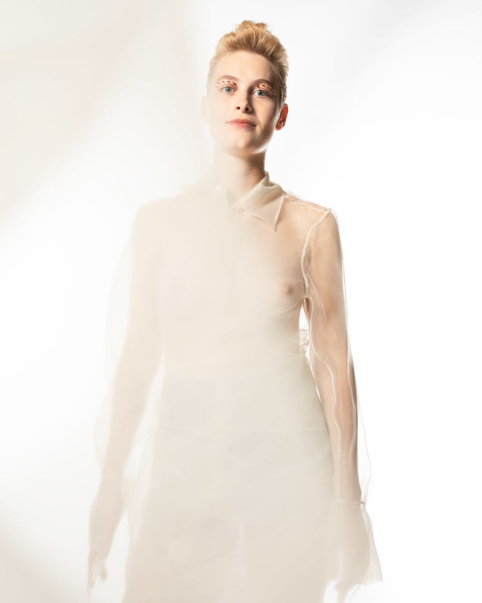 R: We wanted to capture a the feeling of metamorphosis itself. Cells moving rapidly. Mitosis in full force. An organism speeding towards an ambiguous destination. Models emerged from the dark as well as from the light, sometimes becoming invisible only to re-emerge from an unexpected corner again — ungraspable beings shimmering in the show space.