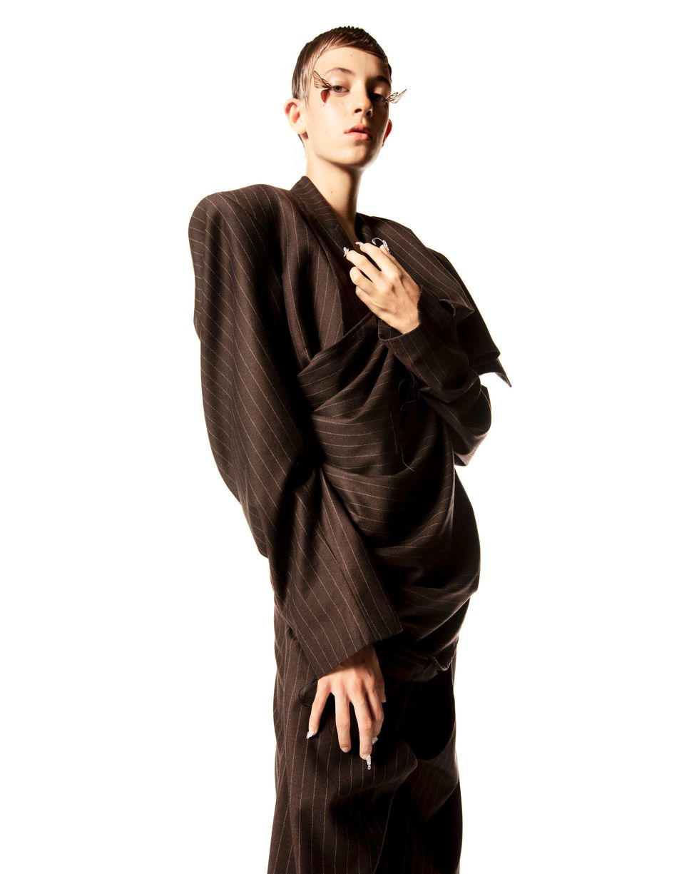 NL: My favorite look right now was the asymmetrical brown pinstripe suit. The left part of this suit is like a whirlwind around the body. A cocoon of protection. I have never draped as much as in this collection and I absolutely love it. It's very much like painting. One step to much and it's ruined. I love how poetic this is.