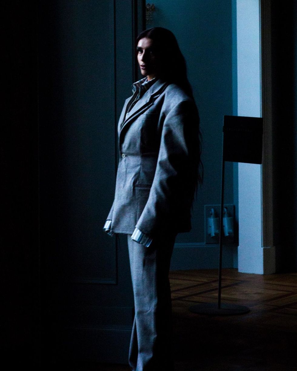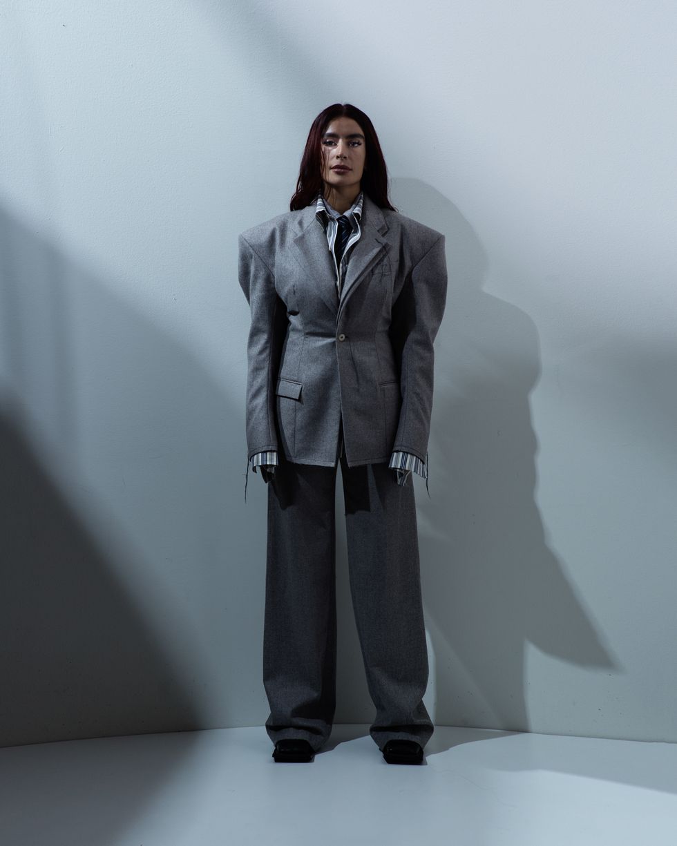 "Sevdaliza was really putting focus on her vulnerability and the hardships she experienced in becoming 'Sevdaliza' on this album, so we wanted to emphasize the strength and power of her as an artist," says Ninamounah, comprised of Designer Ninamounah Langestraat and Brand Director Robin Burggraaf. They pulled inspiration from an oversized coat in their Fall 2020 collection, and built off its "rounded motor sleeve and straight, powerful fit" to construct a full grey suit with extreme shoulder pads and a boxy silhouette. For Ninamounah, this look portrayed Sevdaliza "as the strongest version of herself."