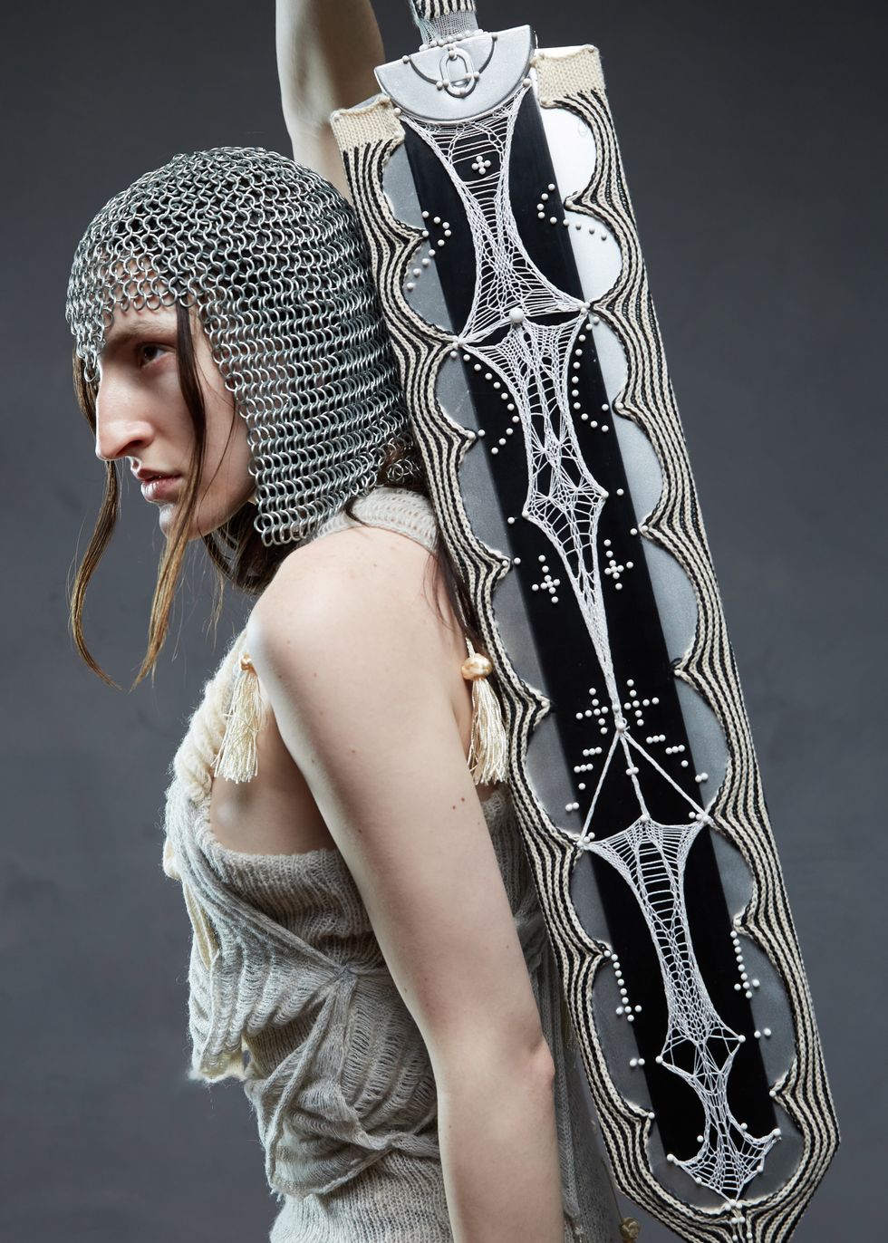 I entitled it “Late with Coffee,” and it's this weird, horrific love-letter-slash-hate-mail to corporate America. Like I said before, I work a nine-to-five because I need security. I need to balance corporate work and my own practice. “Late with coffee” itself comes from one of my first jobs when my boss was like, “You can't be late with coffee because you're not really late.” That isn't real. One of the looks is the “final boss” with a chainmail hood and a big sword. I imagined sci-fi fantasy and corporate America meshing together. I imagined the final boss in a video game is a CEO, and she invites you into the office, cuts you in half and you're fired.