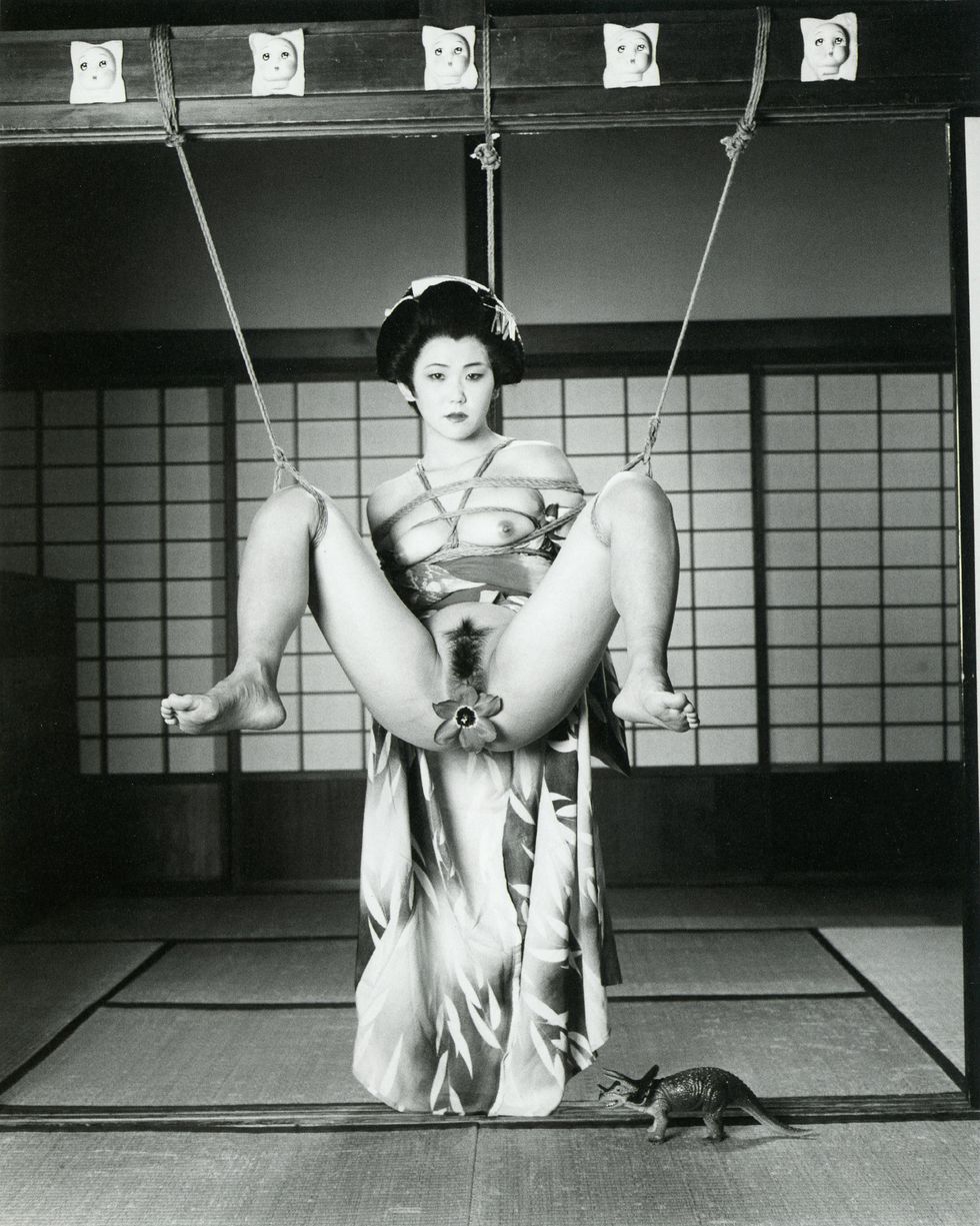 The rope lining the walls are in reference to kinbaku, Japanese bondage known as tight binding. This involves tying up an individual using simple and intricate patterns with hemp rope, which is often used by governmental officials, rebels, or social disruptors, in hostile takeovers, as restraints, and to capture prisoners. The demonstration of power spills into the BDSM culture that Araki chooses to place at the center of his practice. In his case, it is kinbaku-bi that we must speak of, which literally translates as the beauty of tight binding. In fact, Araki's female subjects are staged naked and tied in various erotic positions: on the ground, suspended, upside down. The negotiations of power dynamics are extremely important to Araki, who believes that his subjects and him enter an intense relationship the moment they decide to work together. Interesting, then, that Araki chooses a material that is inherently related to domination and power. What kind of relationship is Araki choosing to depict?